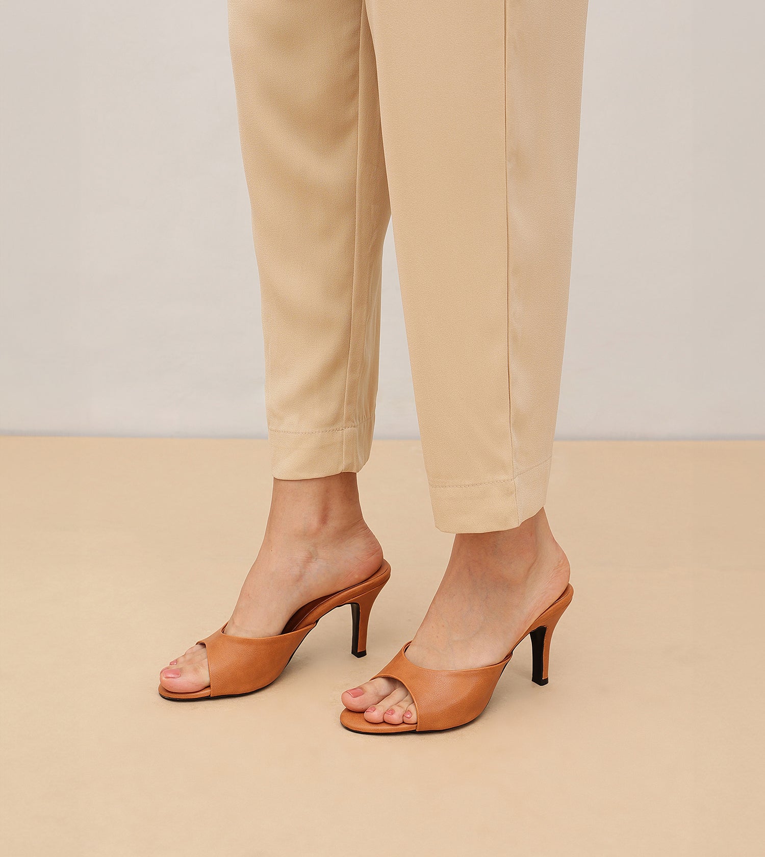 Embrace bold confidence with these minimalist heeled mules in a warm tan hue. Their subtle shine adds an alluring touch to your favorite outfits, while the slim heels provide a chic lift, ensuring you stand out with effortless style.