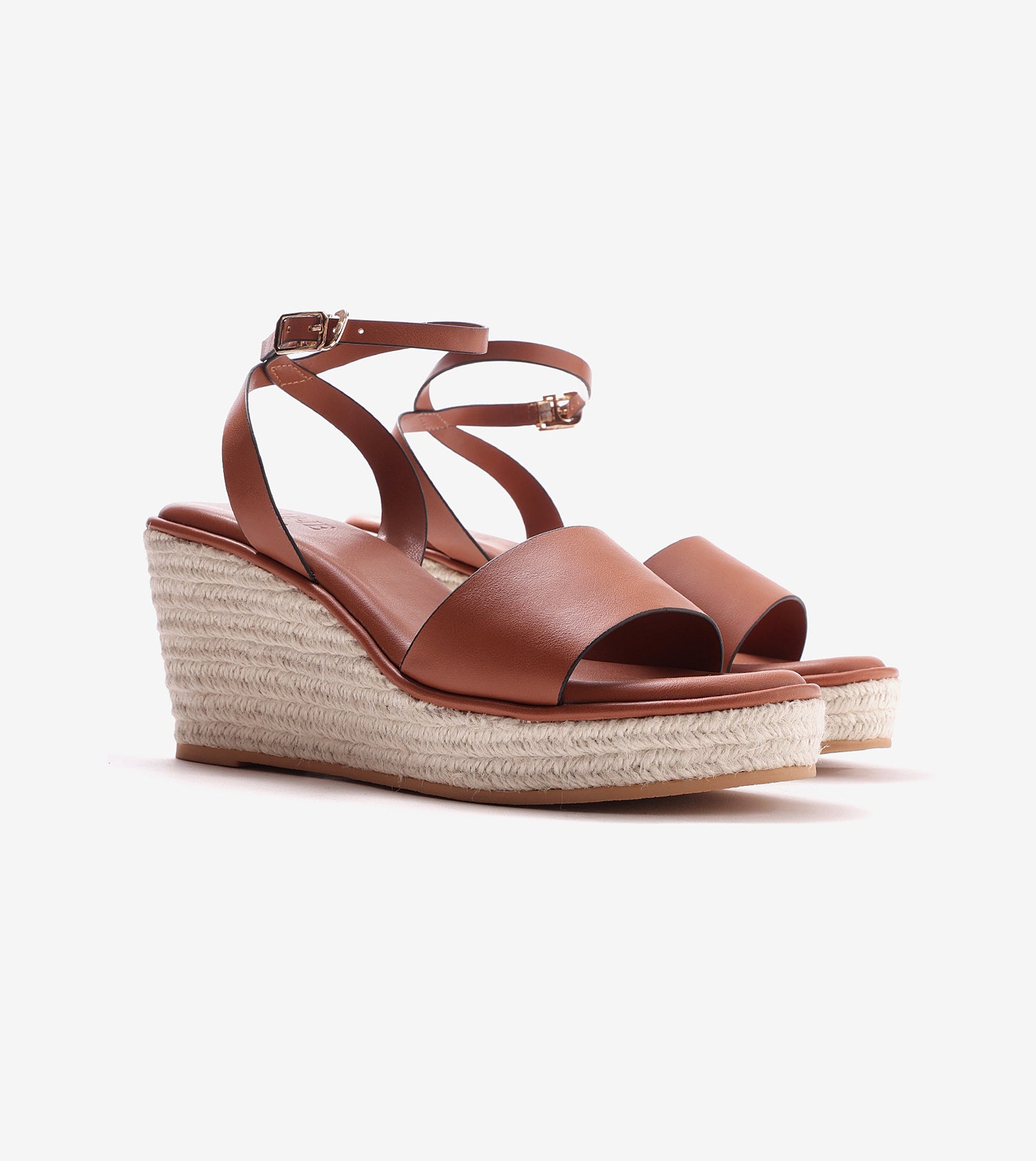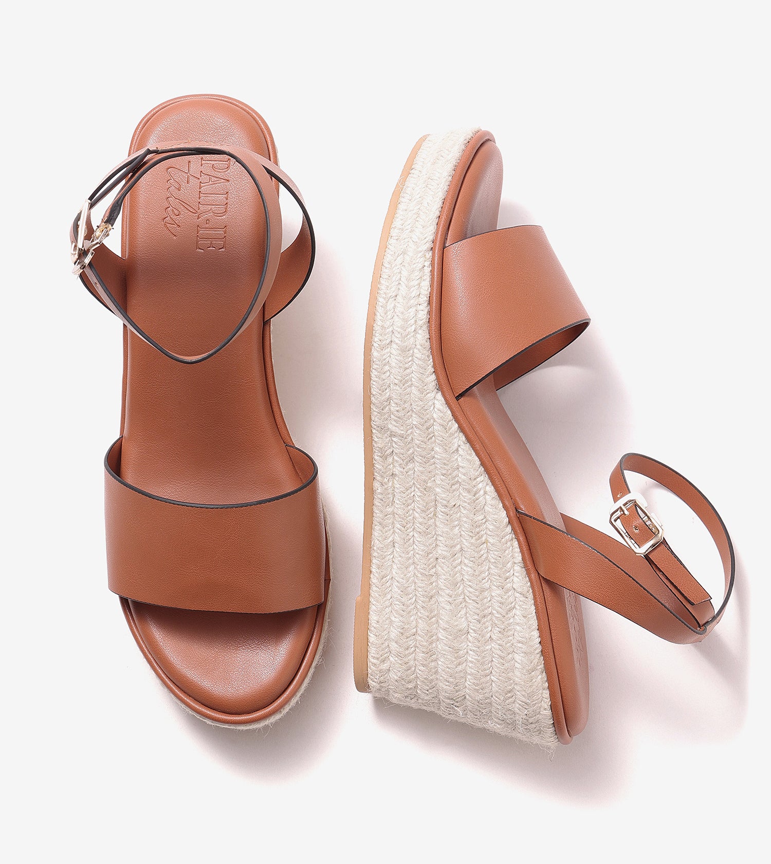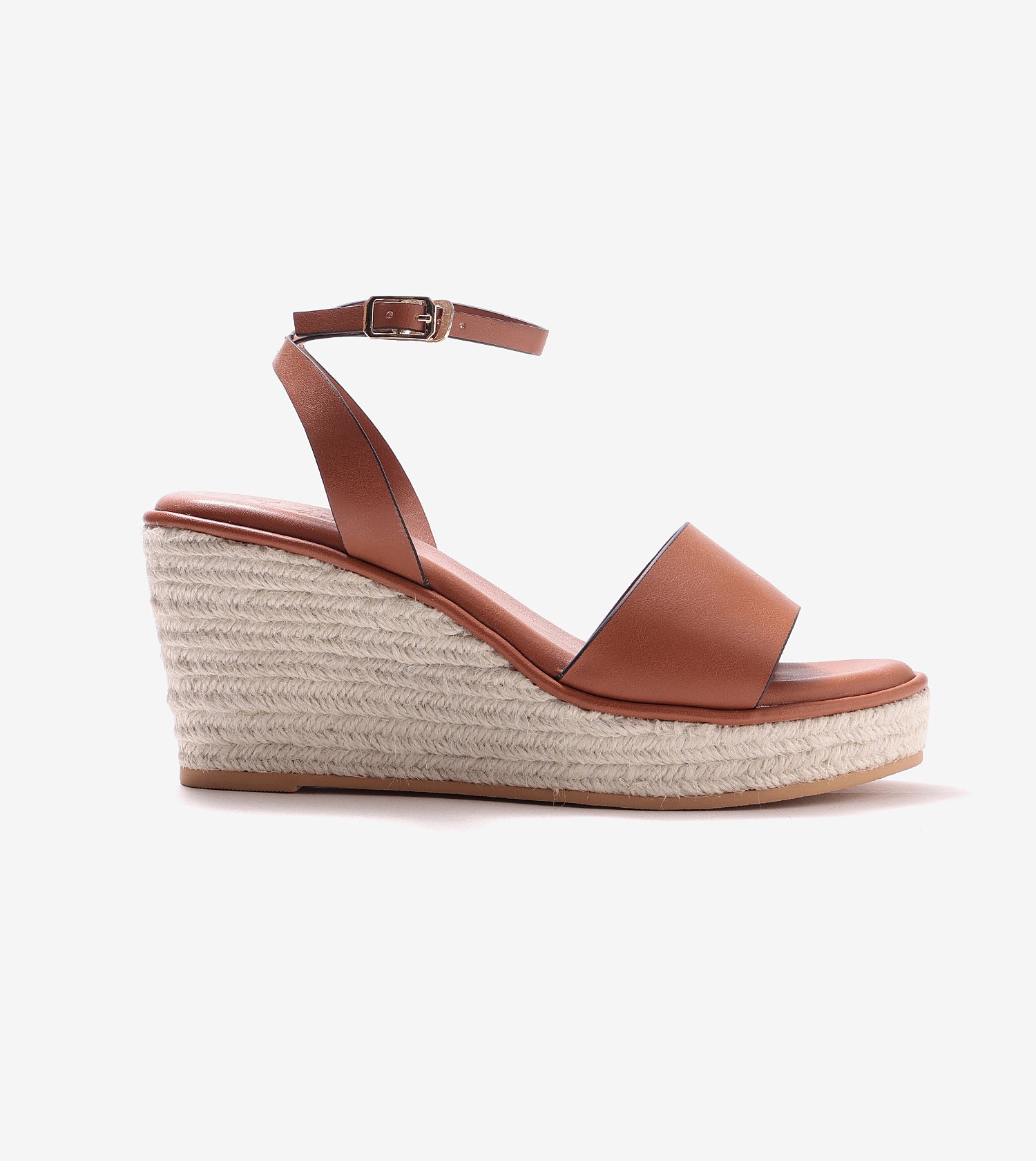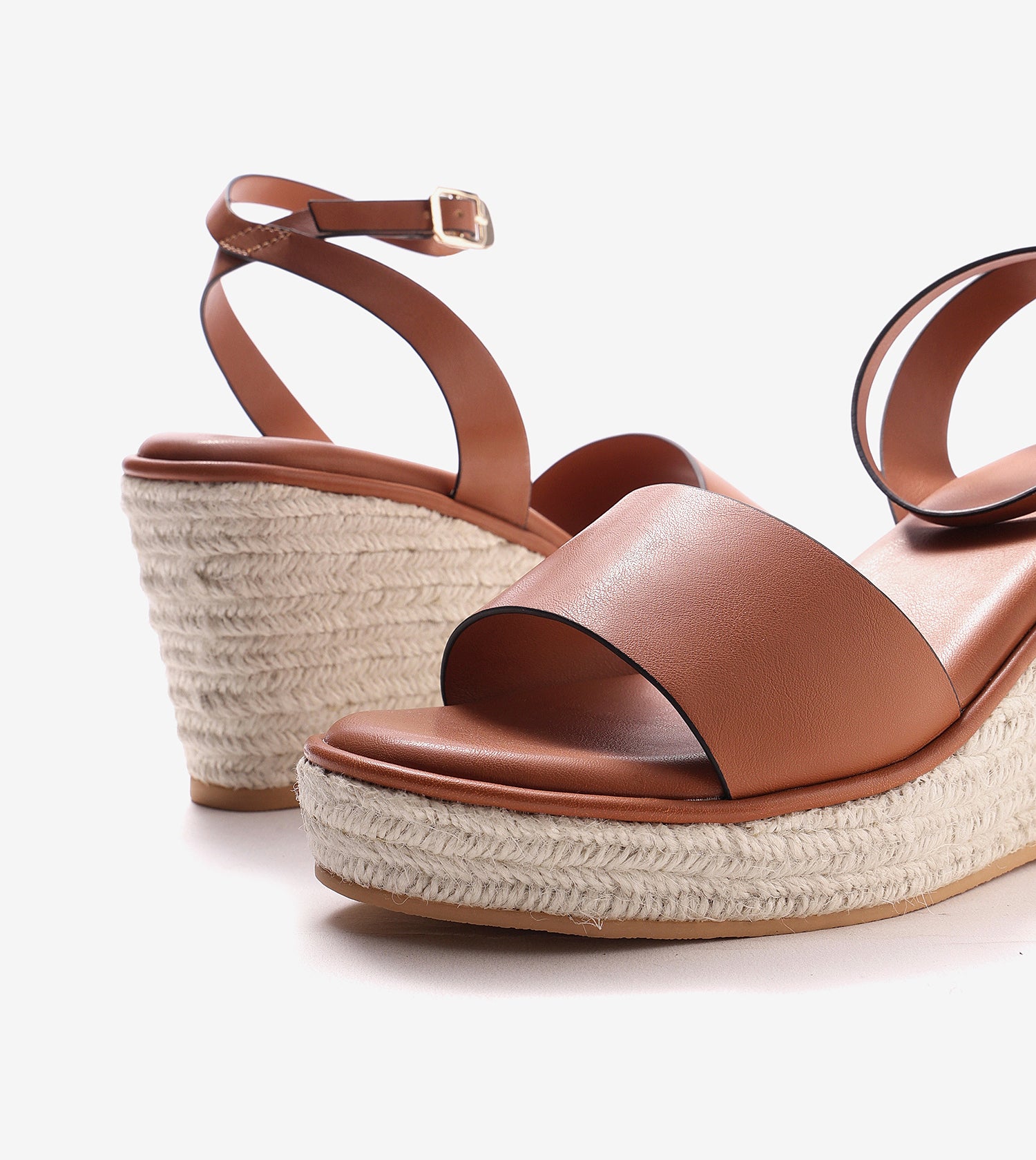 Effortlessly chic, these espadrille wedges feature a tan faux leather upper with a buckled ankle strap for a secure, flattering fit. The jute wedge sole provides a subtle lift, adding a quiet elegance that elevates any look with ease.