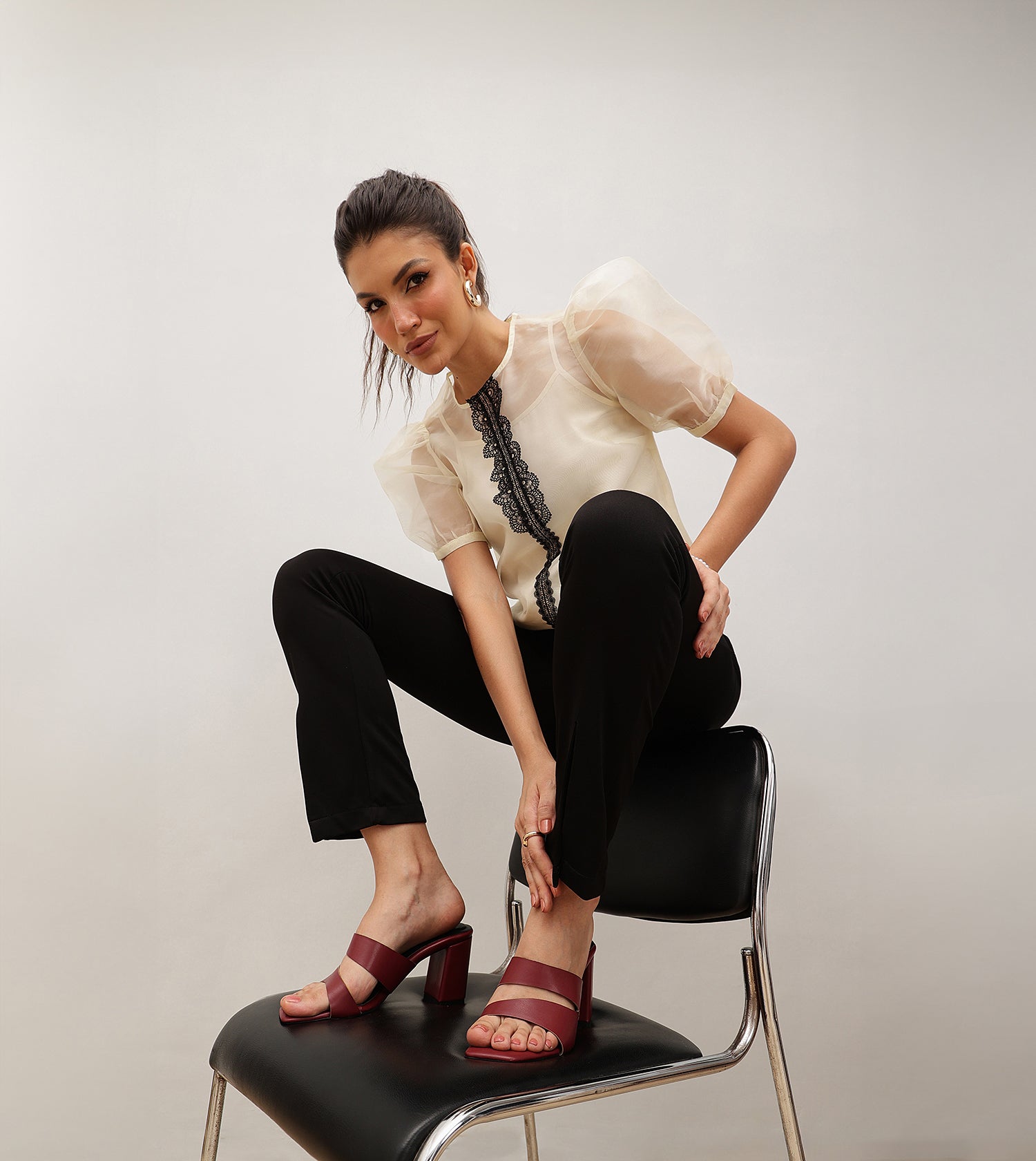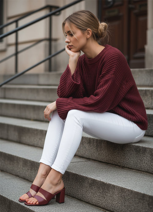 These asymmetric cutout heeled mules exude bold confidence with every step. In a rich maroon hue, they add an alluring touch and a subtle shine to your favorite outfits. Set on sculptural heels, they’re designed to make a statement and set you apart from the crowd.