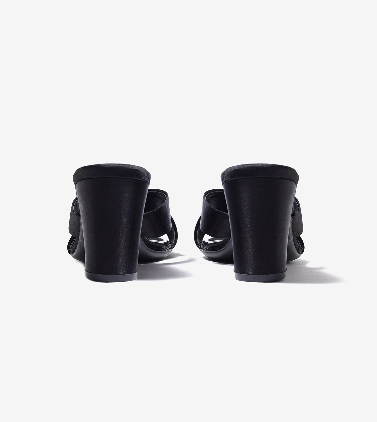Elevate your style with this statement slip-on that perfectly balances power and polish. Designed with wide cross-over straps in satin-finish faux leather, it offers a bold yet refined silhouette. The sleek square toe adds a modern edge, while the block heel lends just the right amount of height and drama. Soft cushioning ensures comfort with every step.