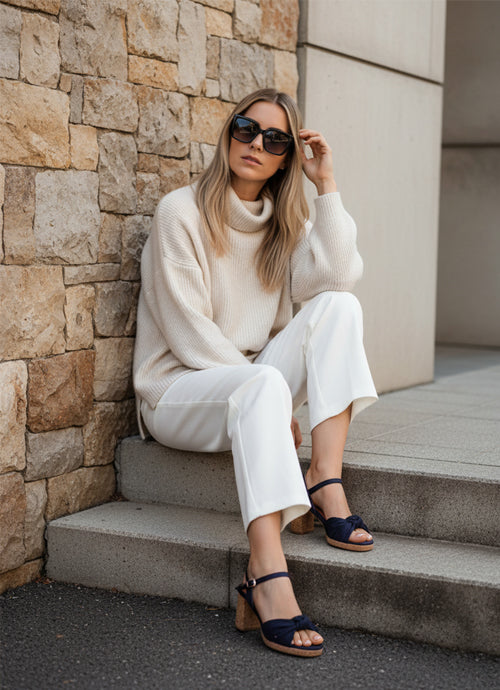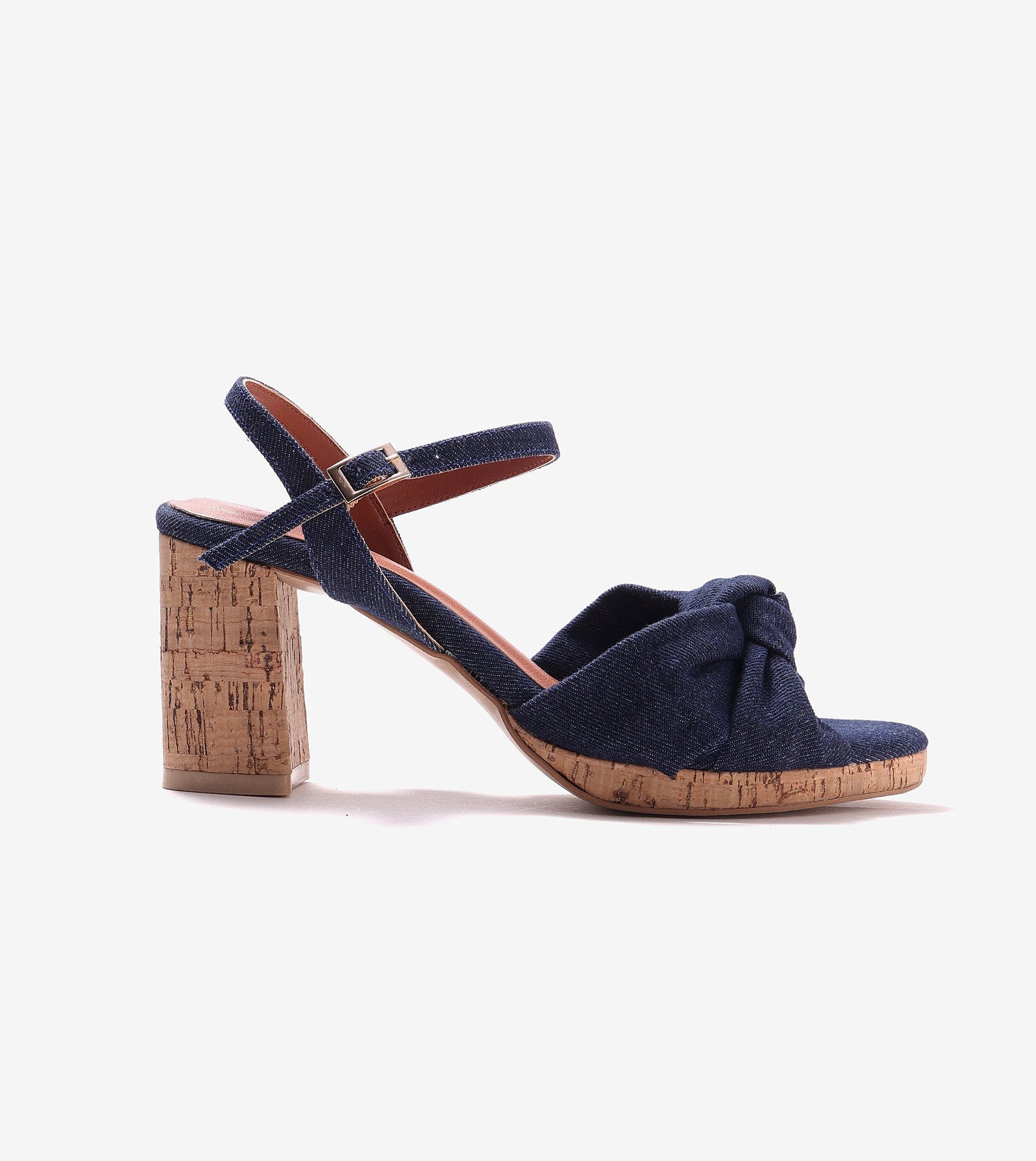 Elevate your style with these stunning platform sandals, designed to impress. Featuring a chic knot detail and cork platform soles in dark blue denim, they’ll instantly take your outfit to new heights. Crafted from faux leather, these sandals are a sustainable choice, letting you strut with confidence and conscious style.