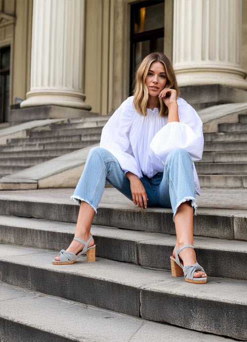 Elevate your style with these stunning platform sandals, designed to impress. Featuring a chic knot detail and cork platform soles in washed denim, they’ll instantly take your outfit to new heights. Crafted from faux leather, these sandals are a sustainable choice, letting you strut with confidence and conscious style.