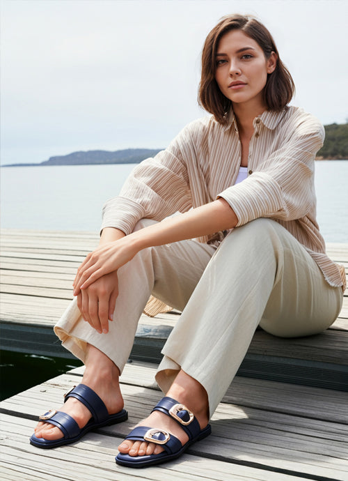 Complete both formal and casual ensembles with these elegant double-strap sandals. Crafted from soft blue faux leather, the bold gold buckles offer a striking contrast that makes this pair stand out. Designed with cushioned footbeds, they promise all-day comfort - perfect for warm-weather days when style and ease go hand in hand.