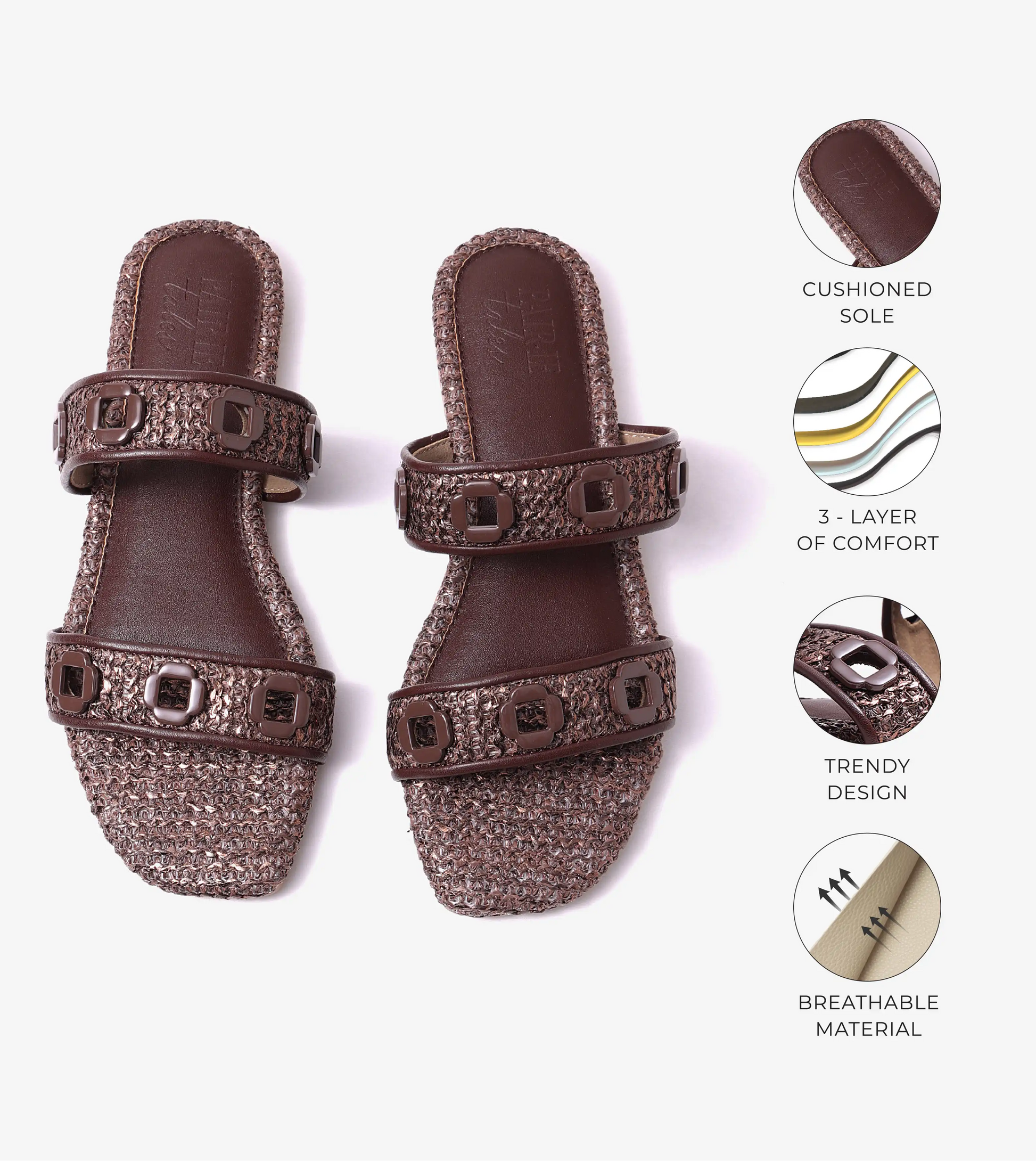 Double Strap Slide Sandals With Metal Adornment - Brown