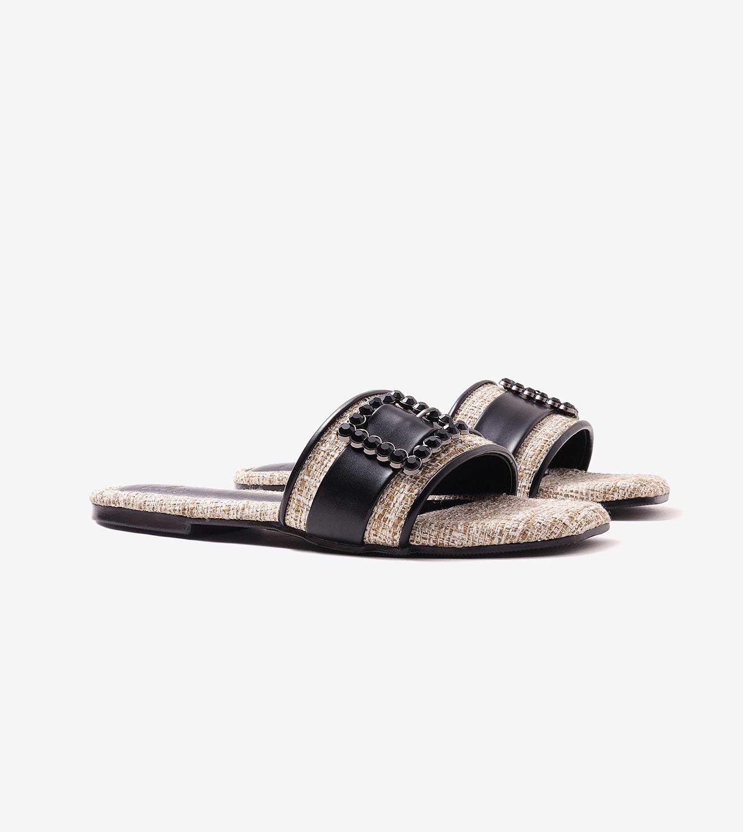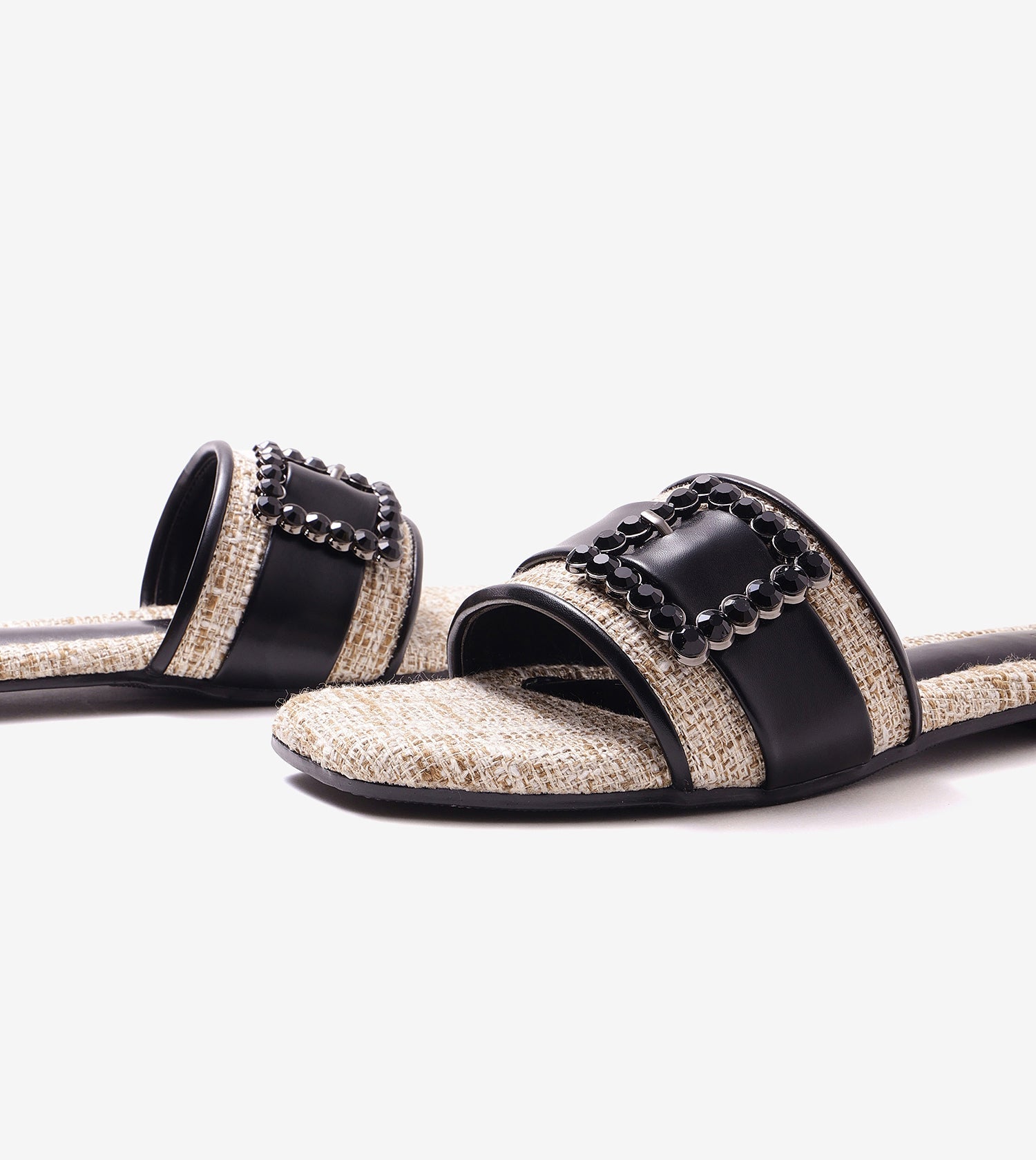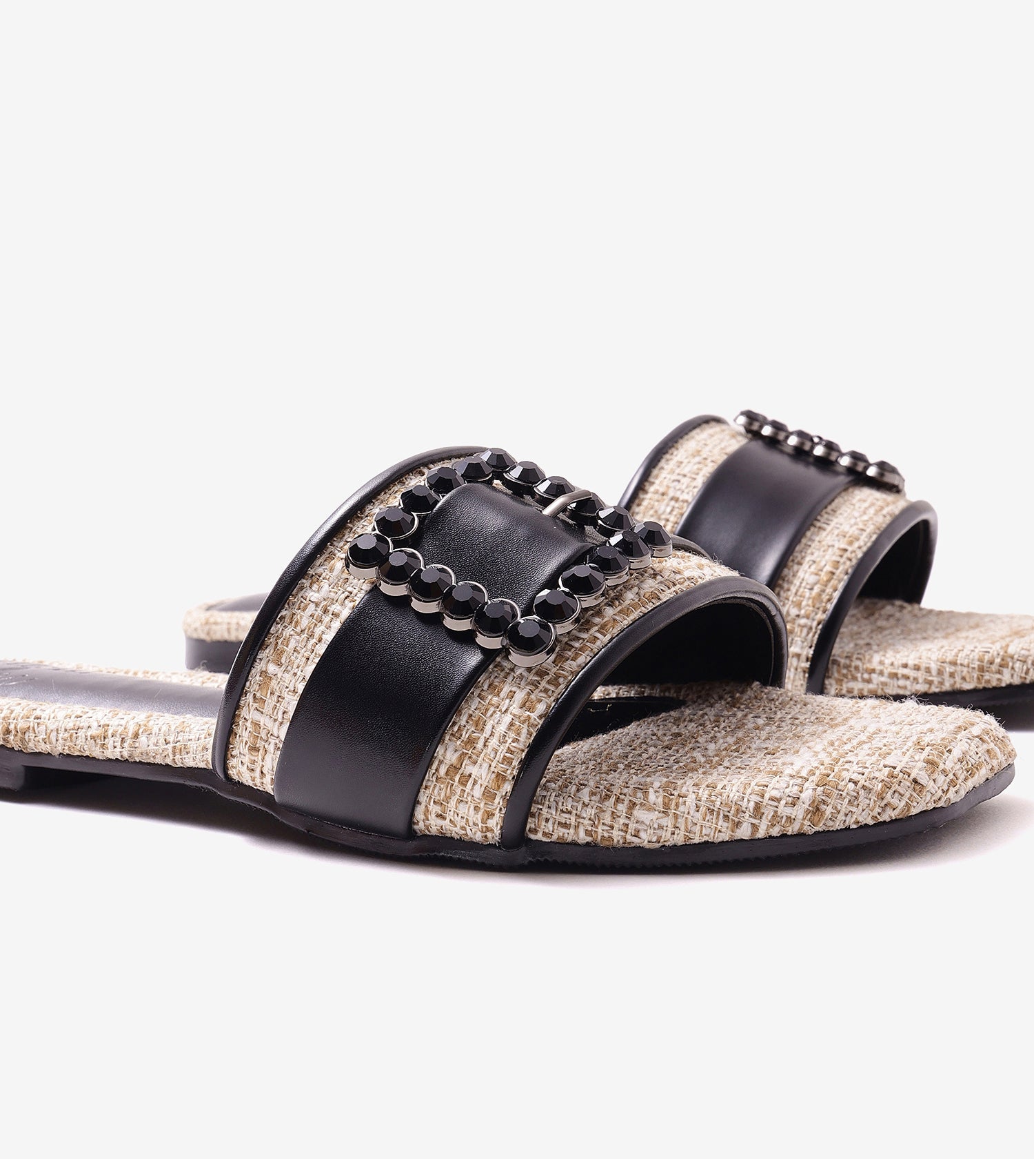 Step into sophistication with this embellished slip-on heel that effortlessly combines luxury with comfort. Crafted in textured faux leather with a woven finish, this pair features a statement crystal-embellished buckle that adds instant glam. The sleek square toe and mid-heel silhouette make it the perfect blend of polish and practicality.