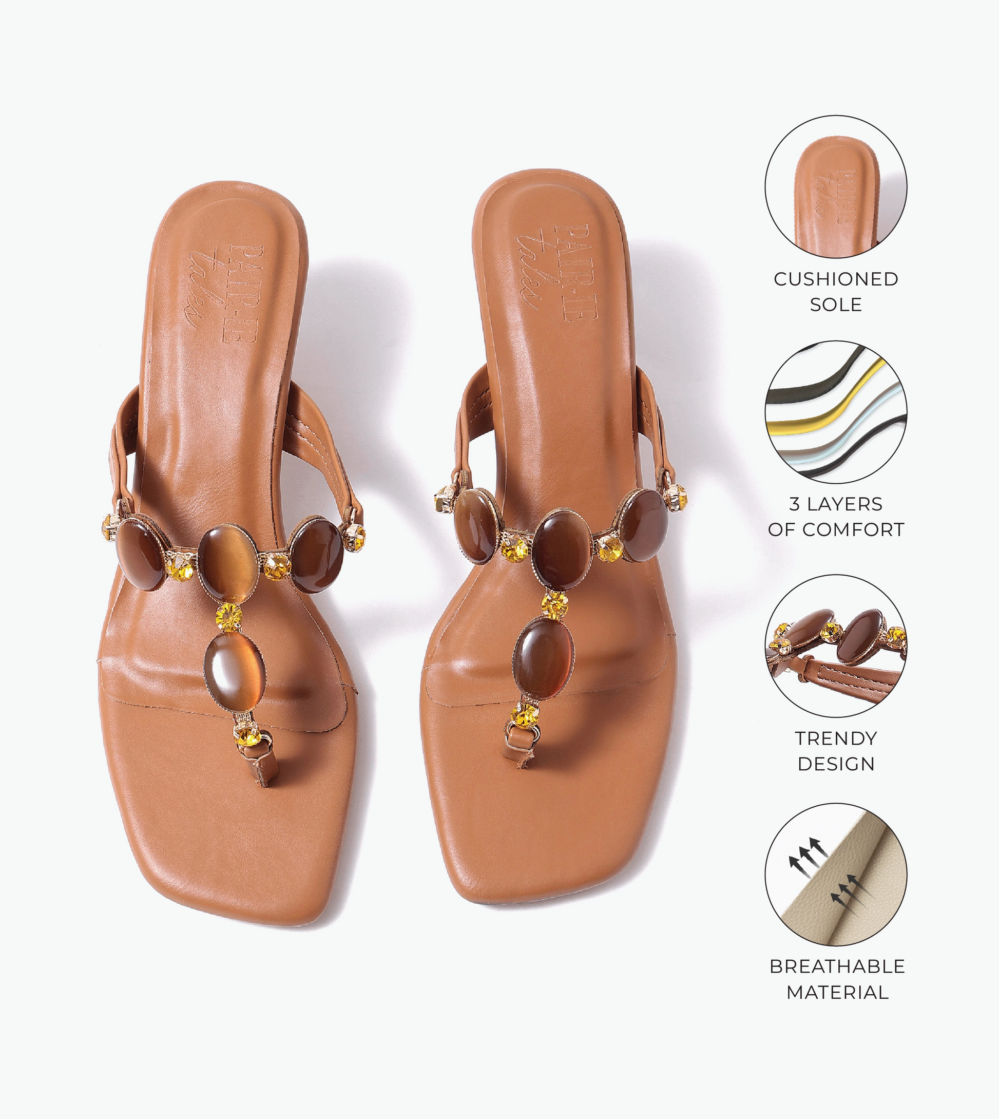 Embellished T-Strap Beaded Heels - Tan