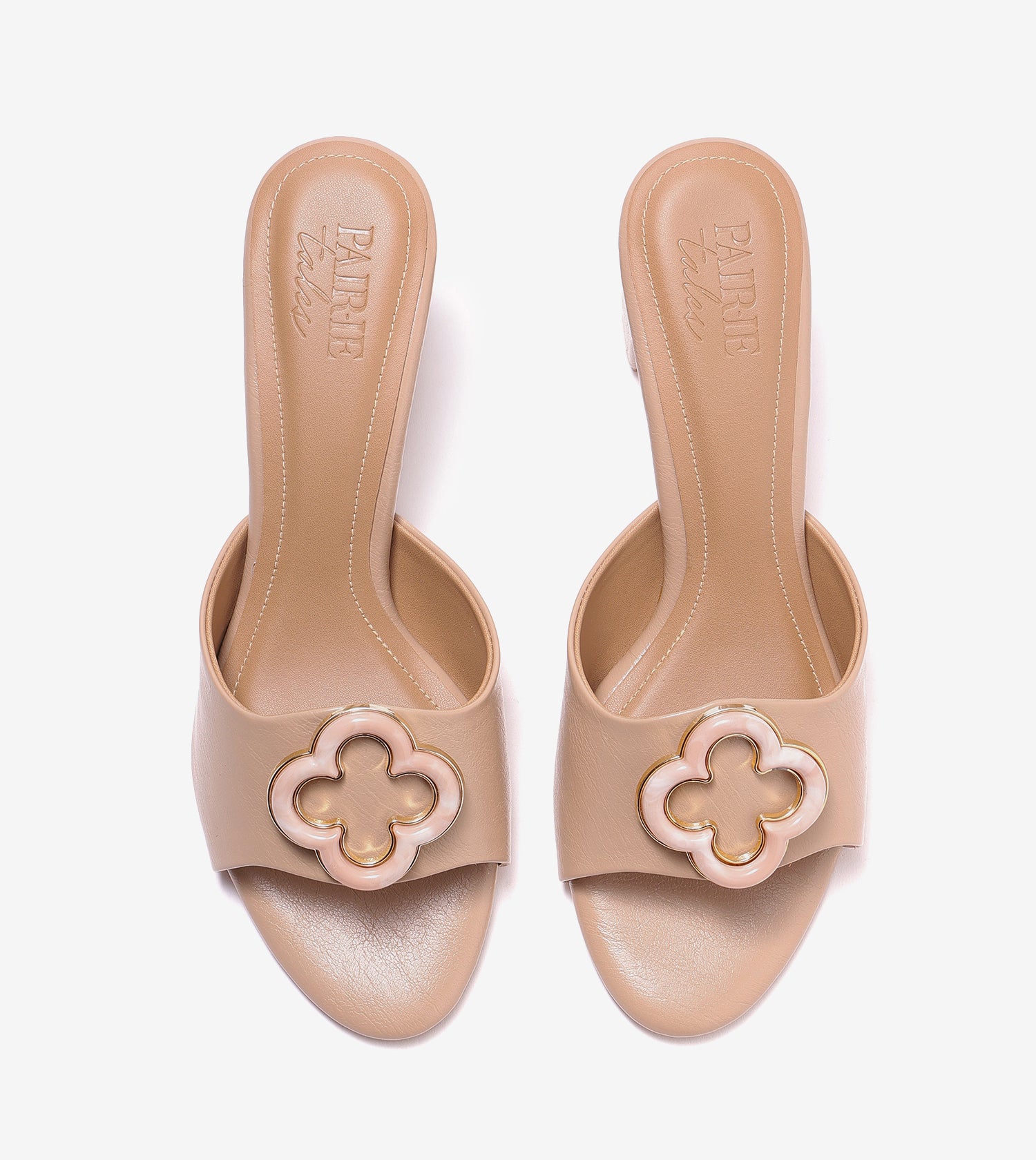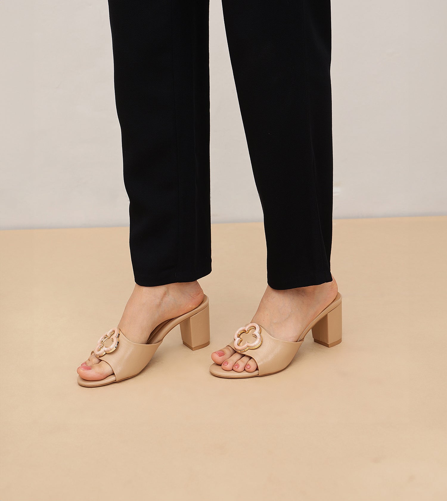 These block-heel mules make a bold statement with thick, eye-catching straps adorned with a floral trim. The sleek round-toe silhouette adds a contemporary twist to a timeless design. In neutral beige, this pair seamlessly complements any wardrobe, offering versatility for any occasion. The sturdy block heels provide a flattering lift while ensuring all-day comfort.