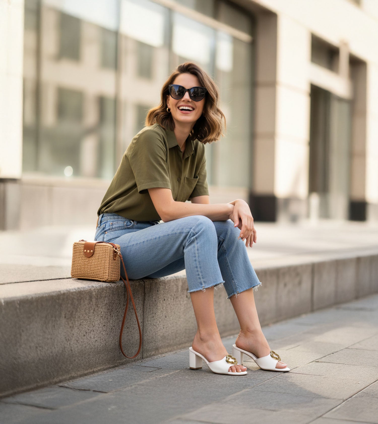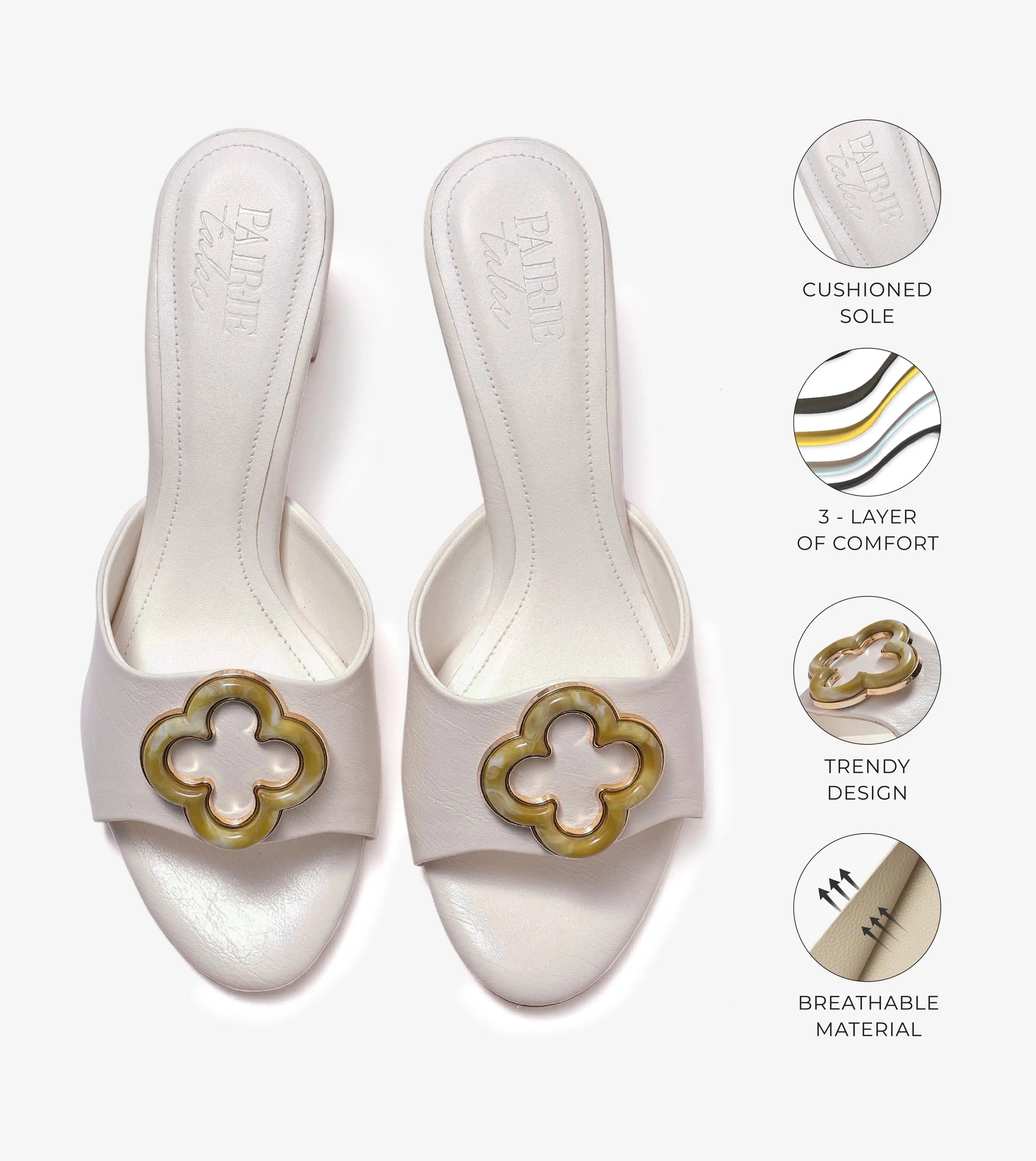 Make a statement with every step in these block heeled sandals, crafted to turn heads. Featuring intricate floral cutout details framed by lustrous metallic rings, this white pair effortlessly combines boldness with elegance. Designed for all-day wear, they promise to elevate your style from morning to night with seamless sophistication.
