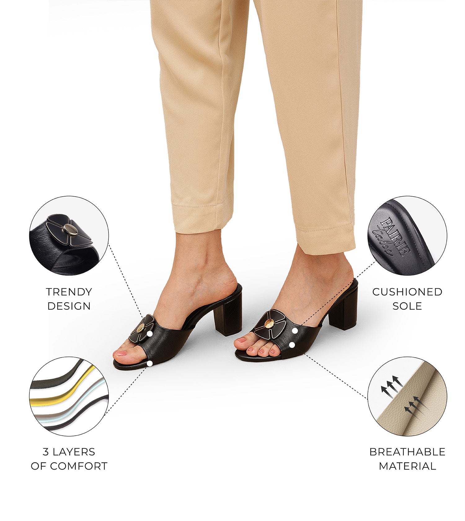 These block-heel mules make a bold statement with thick, eye-catching straps adorned with a floral trim. The sleek round-toe silhouette adds a contemporary twist to a timeless design. In classic black, this pair seamlessly complements any wardrobe, offering versatility for any occasion. The sturdy block heels provide a flattering lift while ensuring all-day comfort.