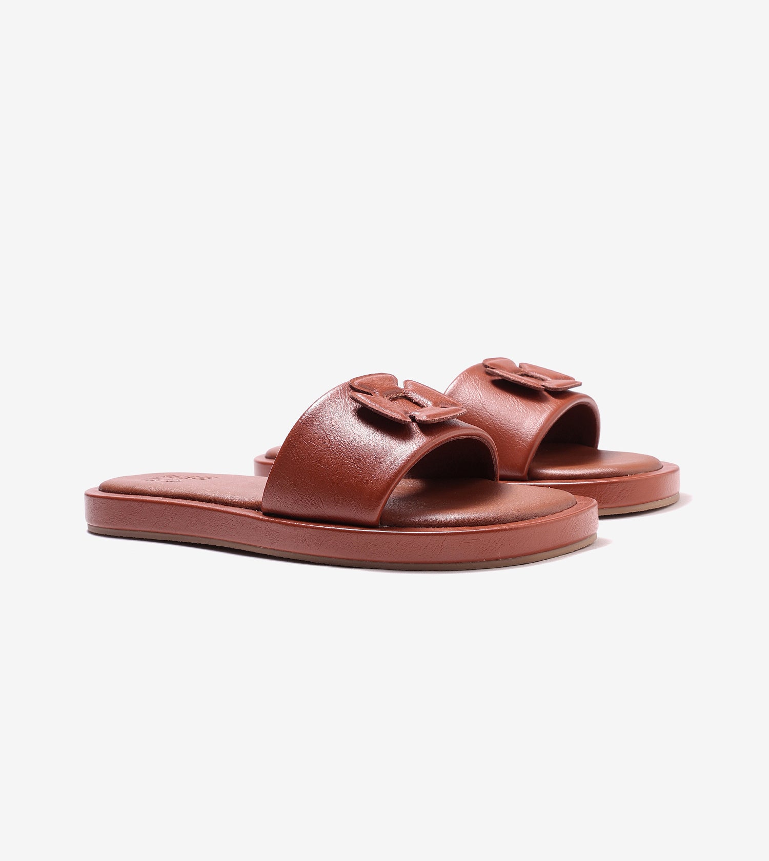 The classic sport slide gets a sophisticated refresh in camel. Crafted from textured faux leather, it features a plush, oversized floral accent that adds a soft yet eye-catching detail. With its puffy upper and slim cushioned sole, this pair offers all-day comfort and flexibility—perfect for elevating casual looks with an easy, playful charm.