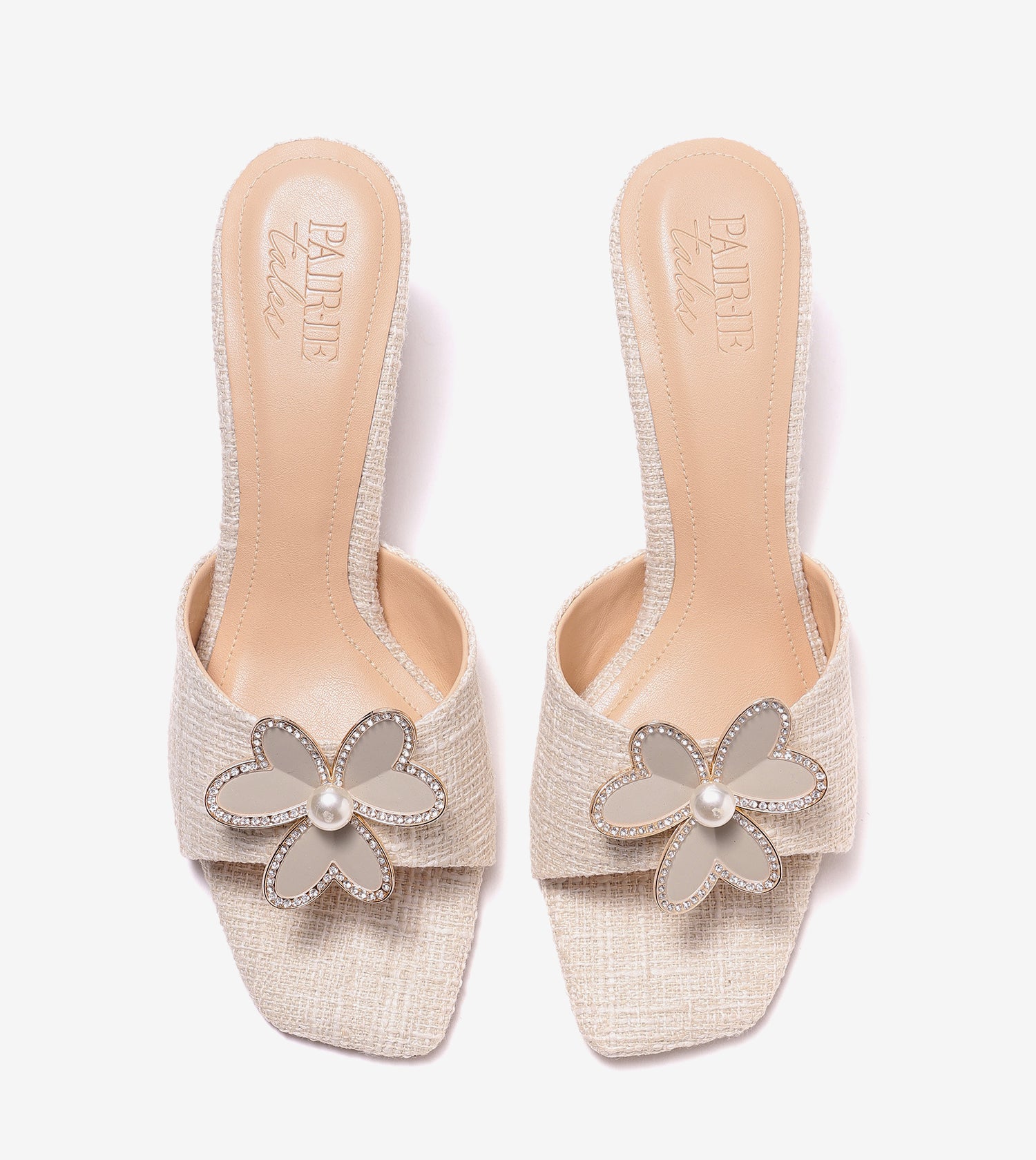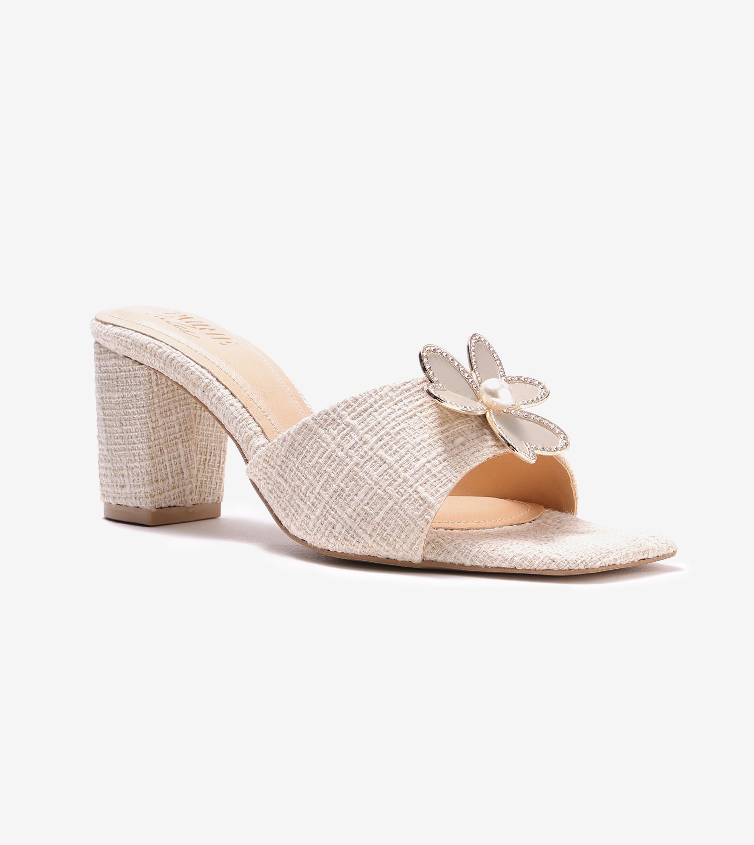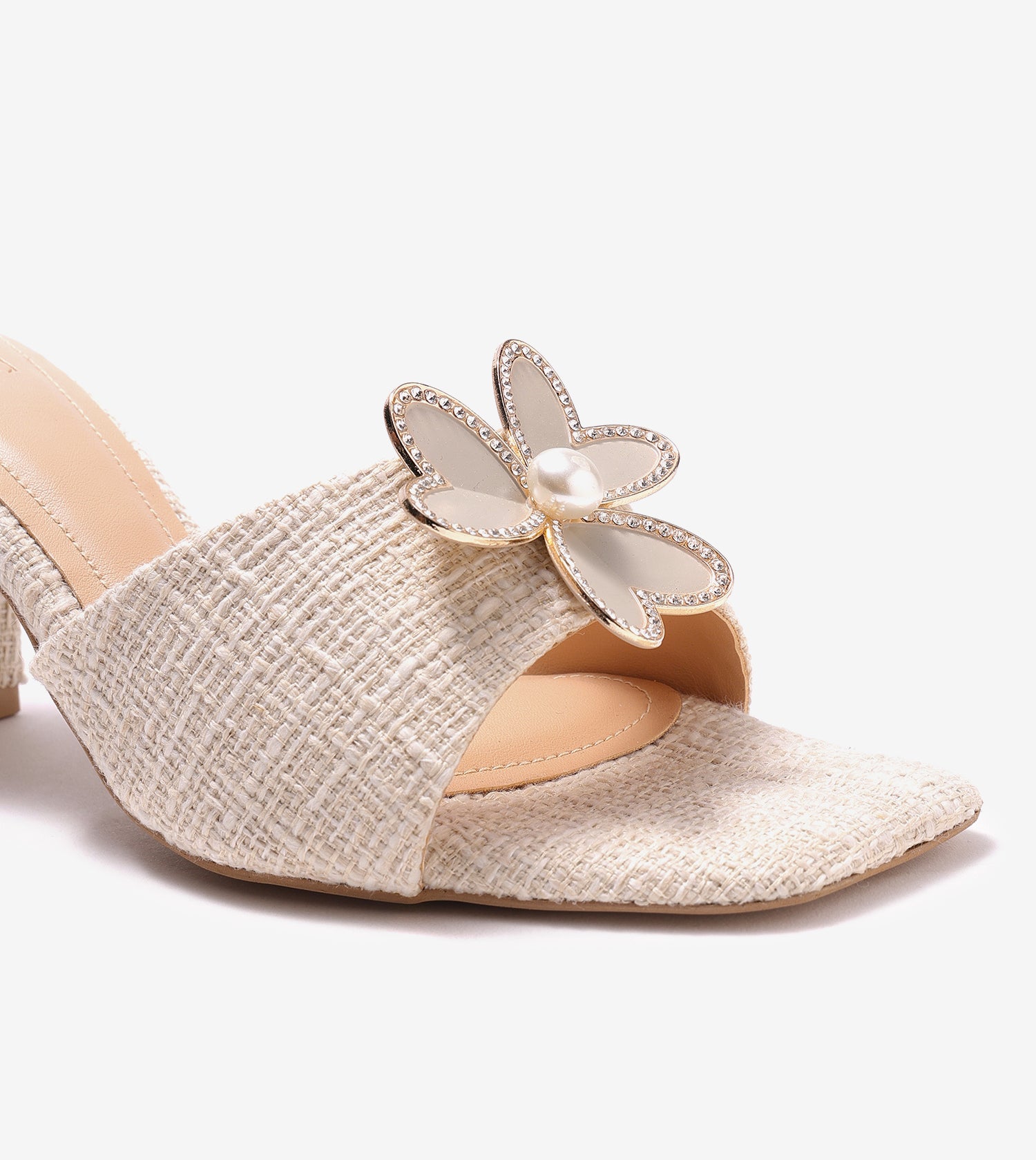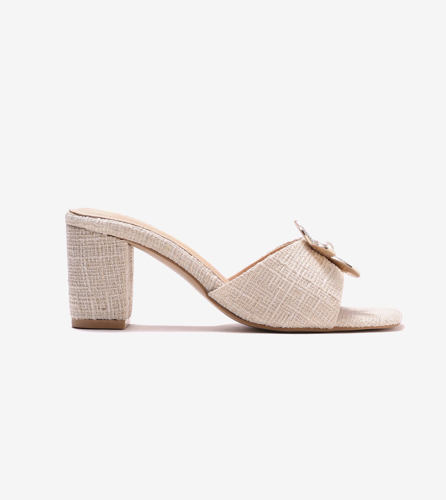 Jute Block Heeled Mule With Metal Adornment - Cream