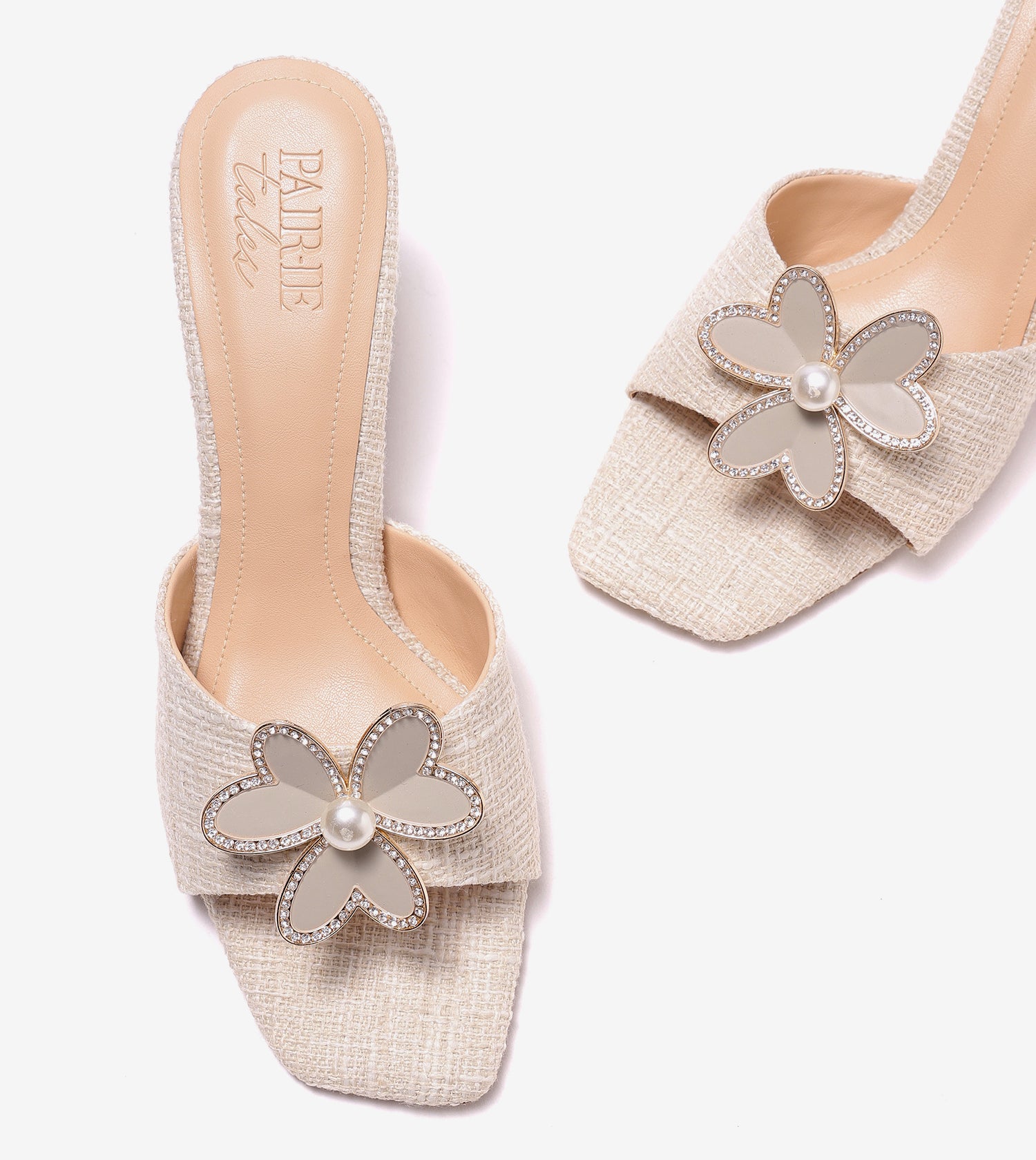 These block-heel mules command attention with thick, striking straps embellished with a delicate floral trim. The sleek round-toe silhouette adds a modern twist to a timeless design. Made from versatile jute fabric, this pair effortlessly pairs with any wardrobe, making them ideal for any occasion. The sturdy block heels provide a flattering lift while keeping you comfortable all day long.