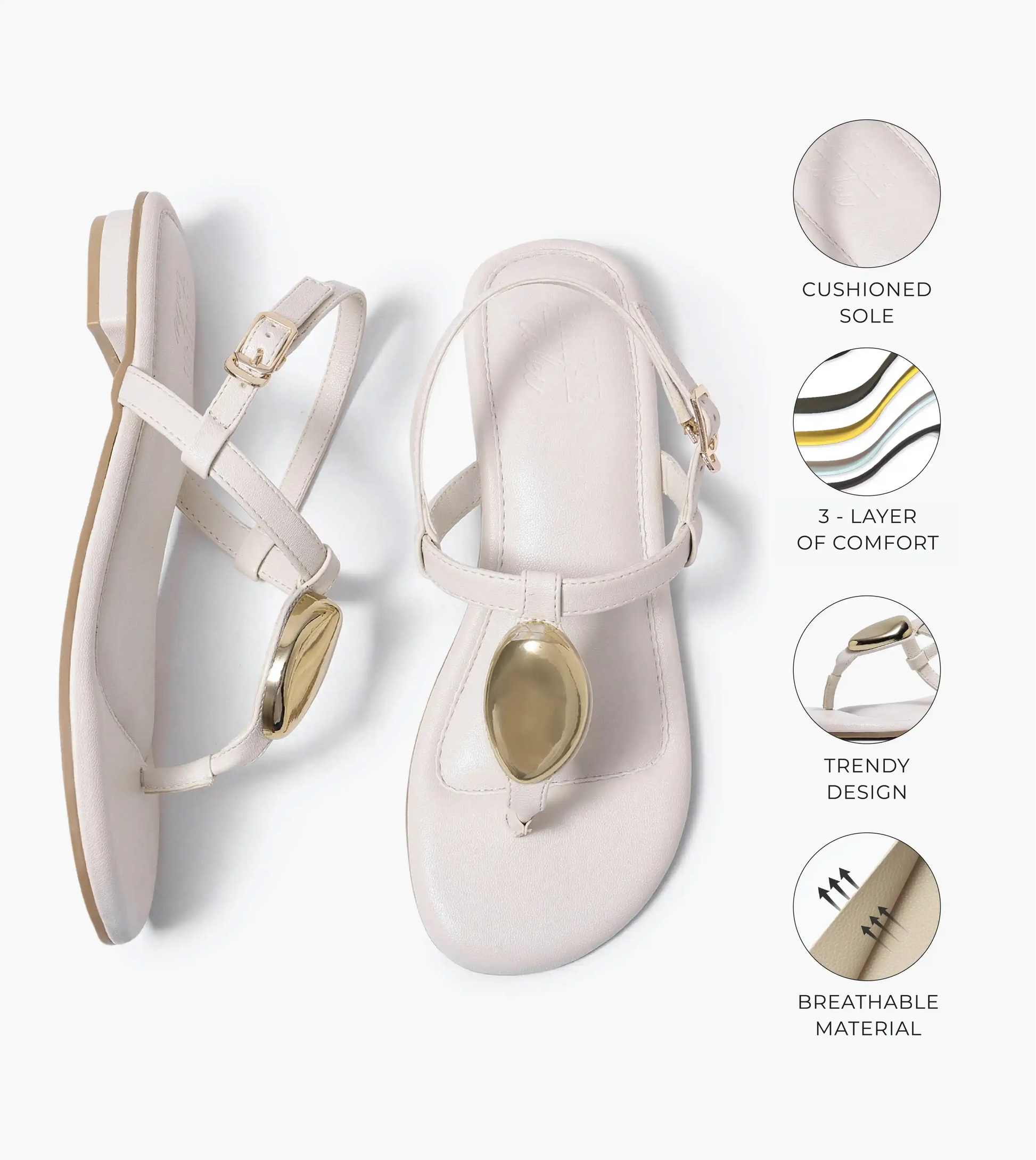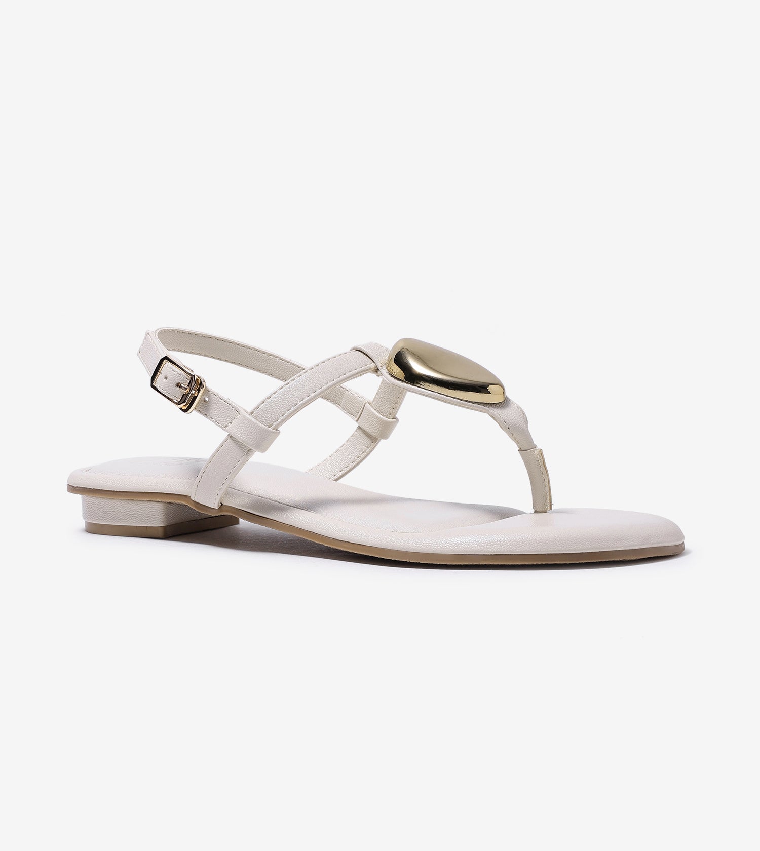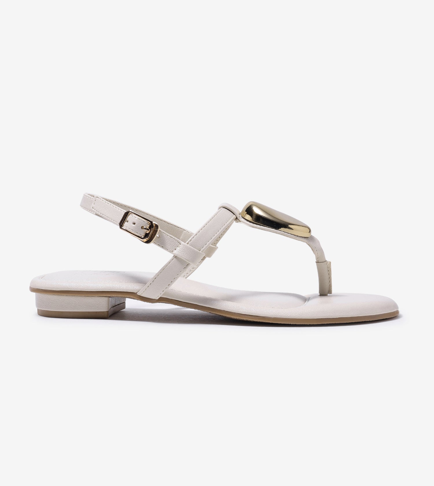 These T-strap flats are designed with a sleek thong-style front and a striking metallic embellishment, they blend statement appeal with everyday versatility. The smooth faux leather construction and cushioned footbed ensure lasting comfort, while the adjustable ankle strap provides a secure, custom fit. Whether it’s brunch, a workday, or a night out, these sandals promise effortless polish with every step.