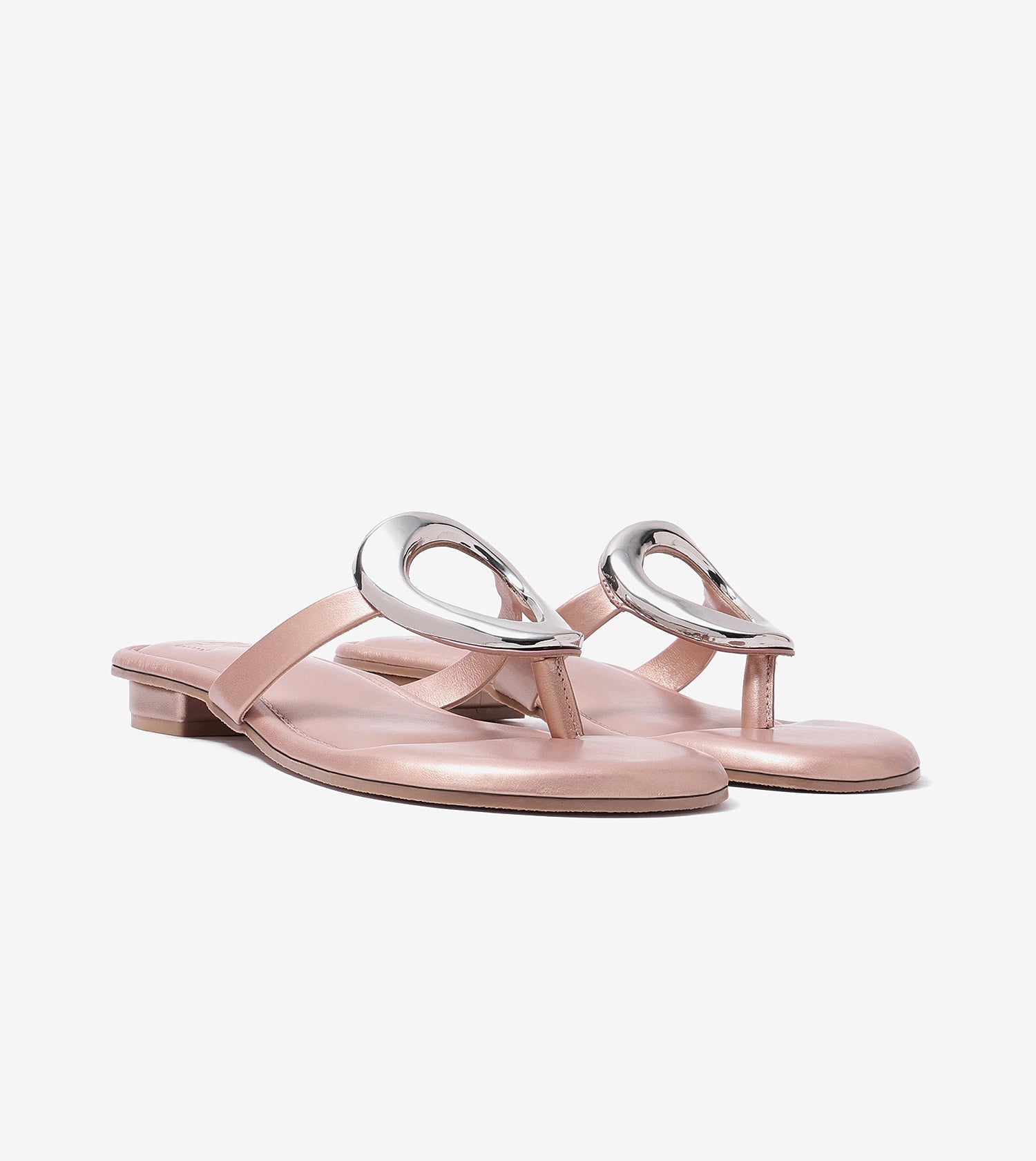 Designed to make everyday dressing effortlessly stylish, these sandals feature a V-strap design that is elevated with a sculptural metallic accent, adding a statement touch while maintaining a sleek, modern aesthetic. The smooth footbed offers enhanced comfort for extended wear. Finished with a low-profile sole for ease and stability, this pair is perfect for all-day outings that call for understated elegance.