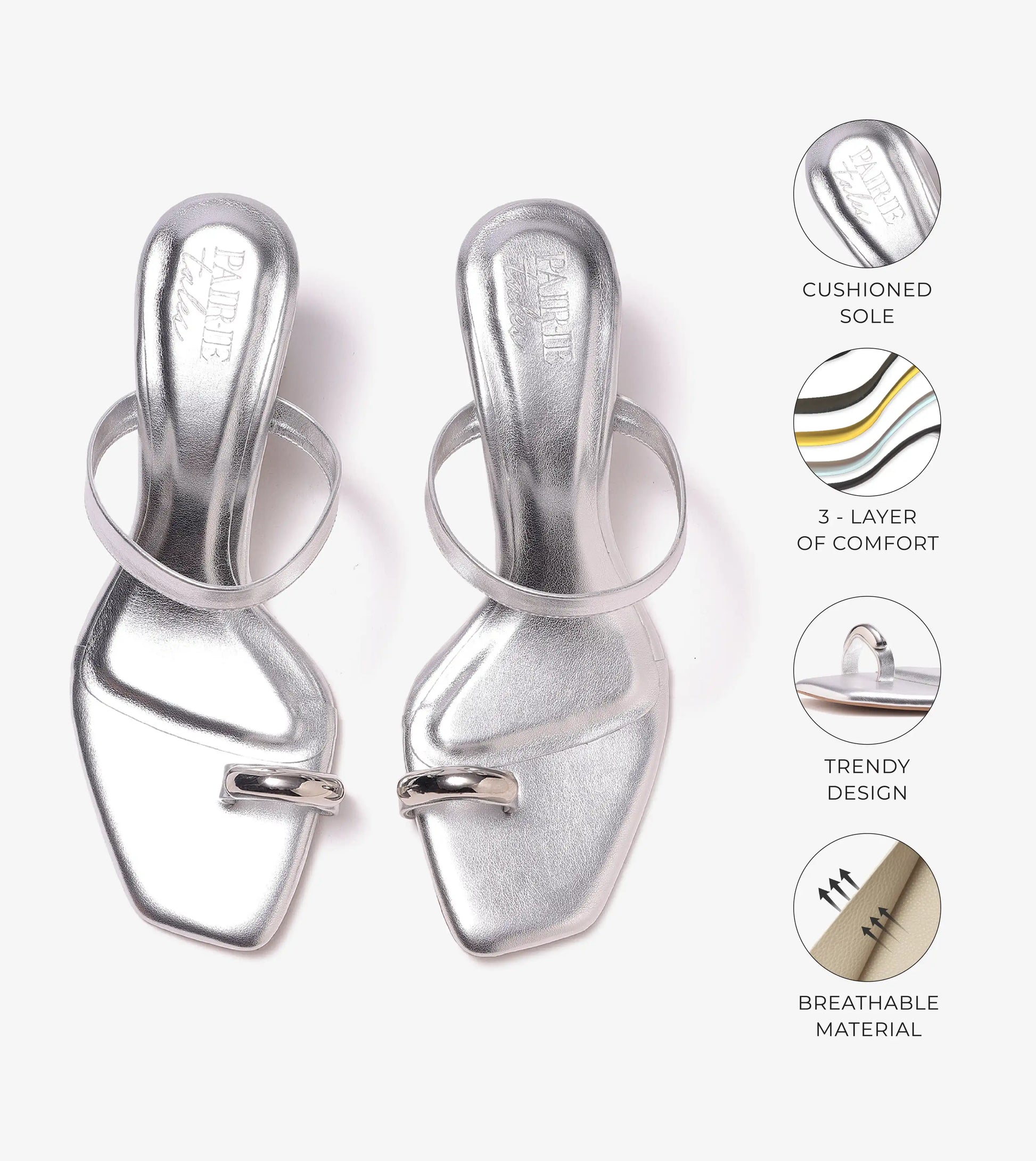 These silver heeled sandals redefine minimalism with a touch of shine. Delicate straps and a gleaming metallic toe-ring detail lend subtle glamour, while the sturdy block heels provide an elegant lift you can count on from dawn to dusk. The perfect balance of polish and ease for every occasion.