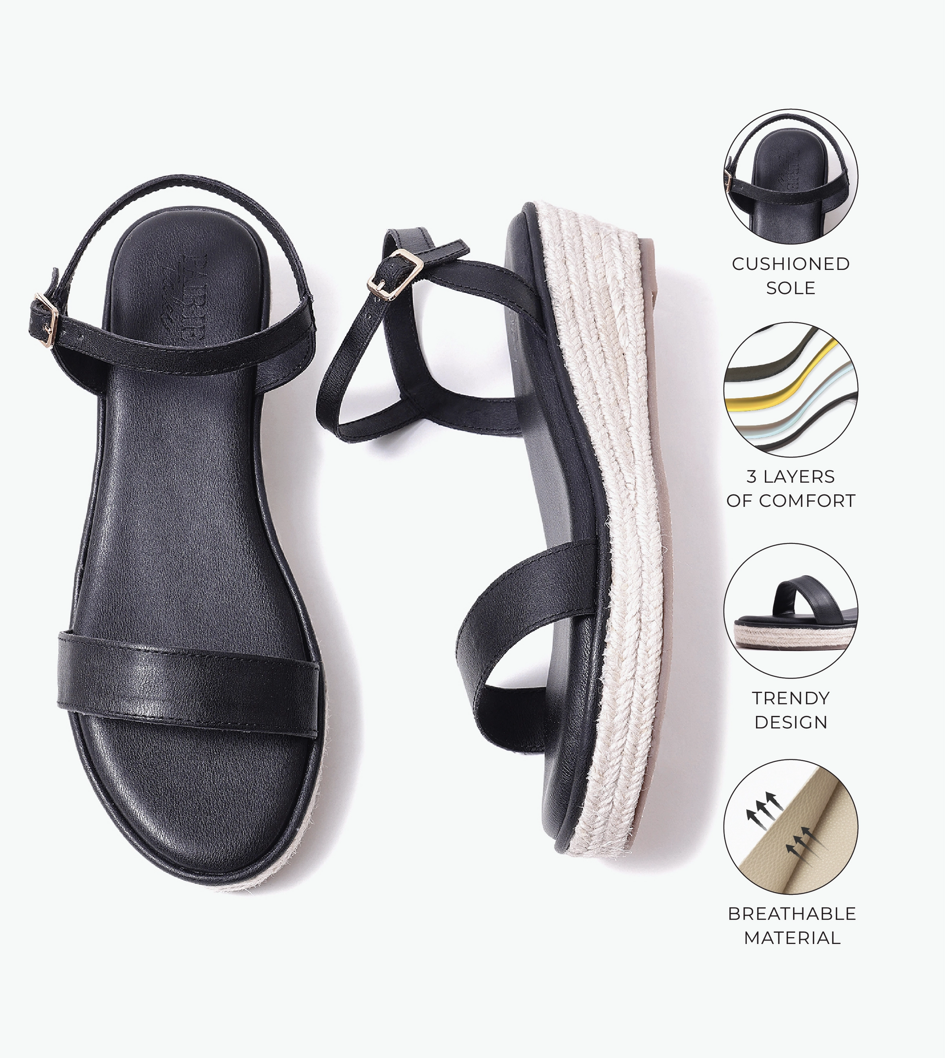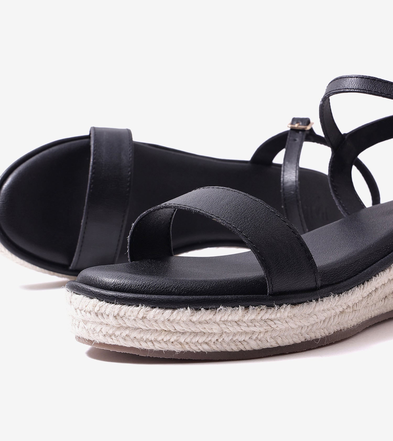 Designed with a refined open-toe silhouette, this sandal features a minimal two-strap construction that offers balanced coverage while keeping the profile light and modern. A slim ankle strap with adjustable buckle provides secure support and a flattering frame around the foot. The gently elevated platform sole is wrapped in an espadrille-inspired finish, adding subtle texture and dimension without visual bulk. This streamlined design delivers everyday comfort with a clean, contemporary aesthetic.
