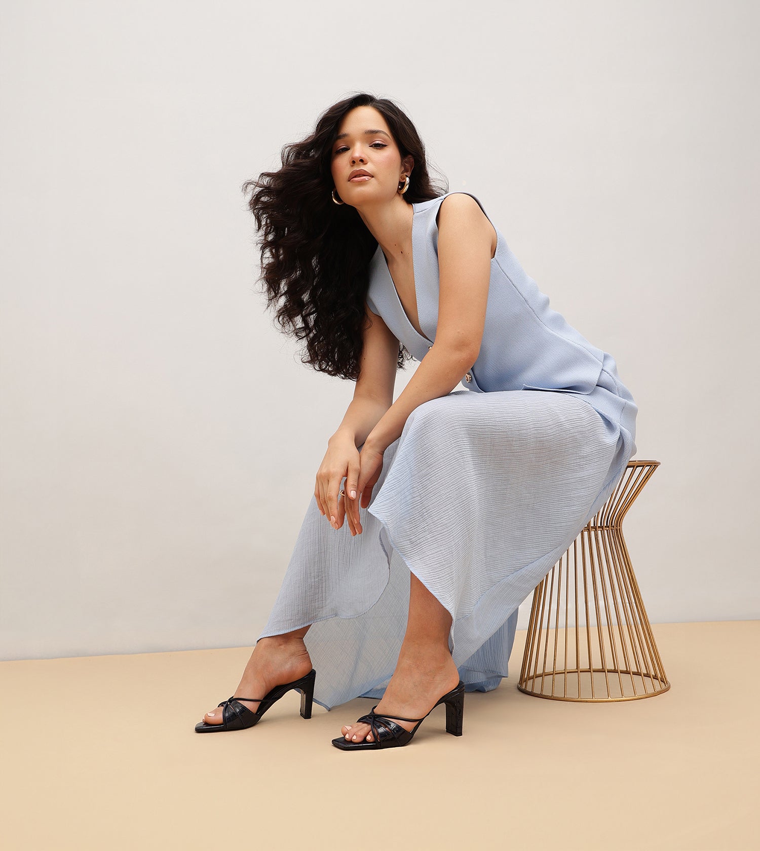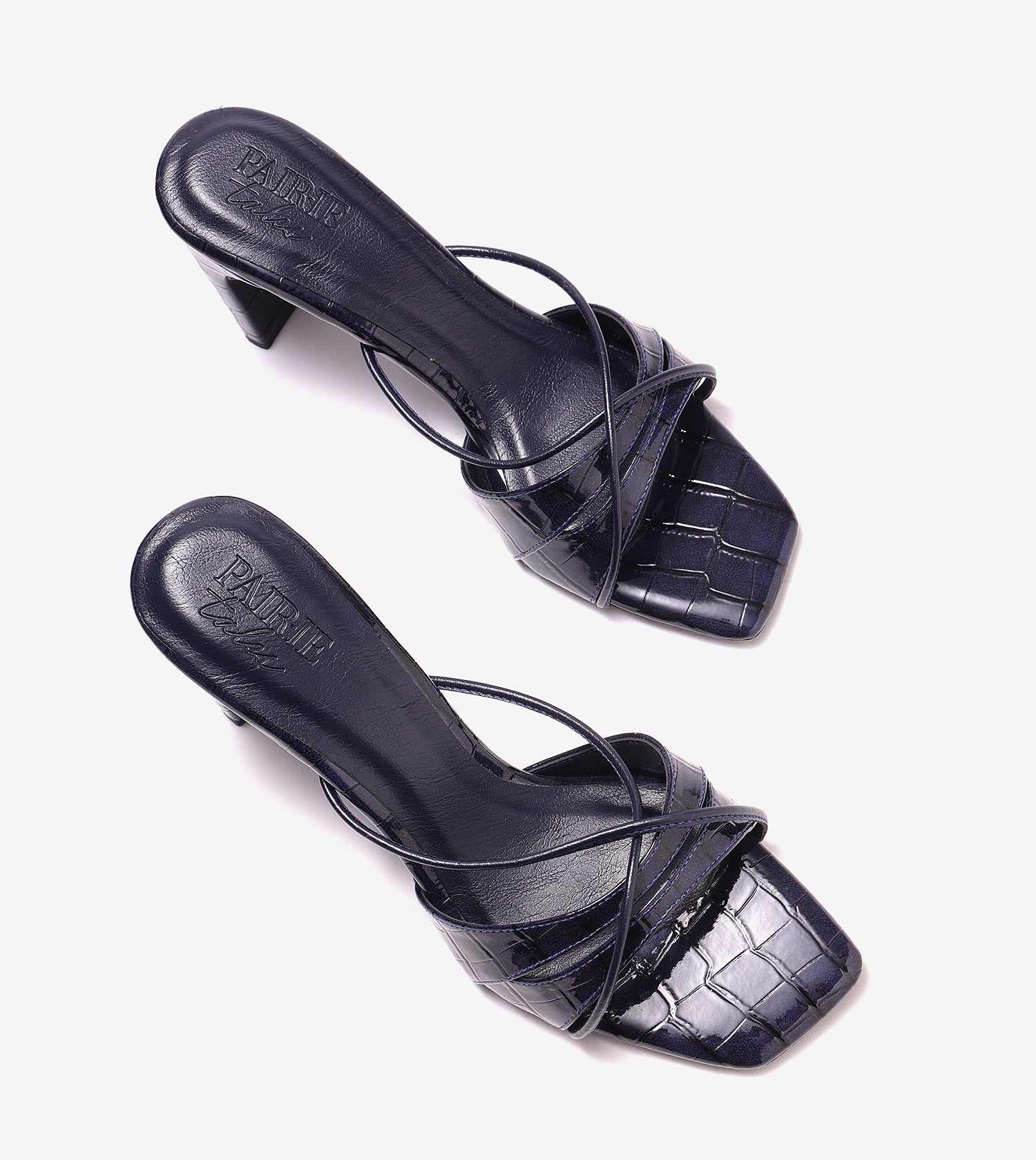 These navy blue croc-effect patent mules blend structure with understated elegance. Designed with dual front straps and sleek cutouts, they’re accented by slim diagonal strings that create a barely-there look while framing the foot beautifully. Crafted from faux leather and set on a 3-inch heel, the square-toe silhouette offers a refined lift—perfect for pairing with midi and maxi lengths alike.