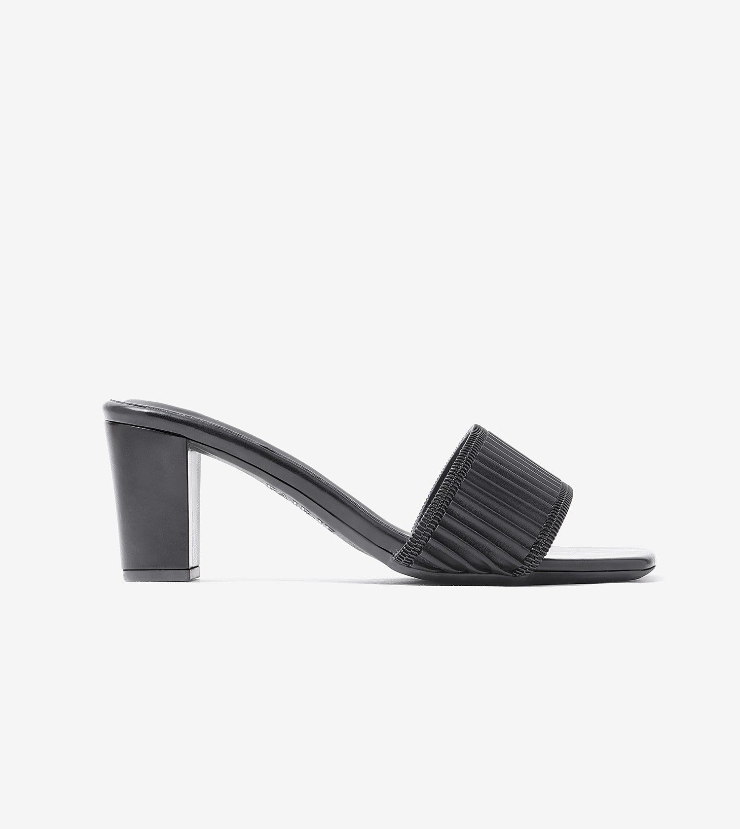 Designed to elevate everyday dressing, these block heel slides feature a pleated strap accented with refined trim for a modern, statement finish. The wide upper offers a secure and supportive fit, while the smooth, cushioned footbed ensures lasting comfort through long hours. Set on a sturdy block heel for added stability, this slip-on silhouette blends contemporary design with effortless wearability.