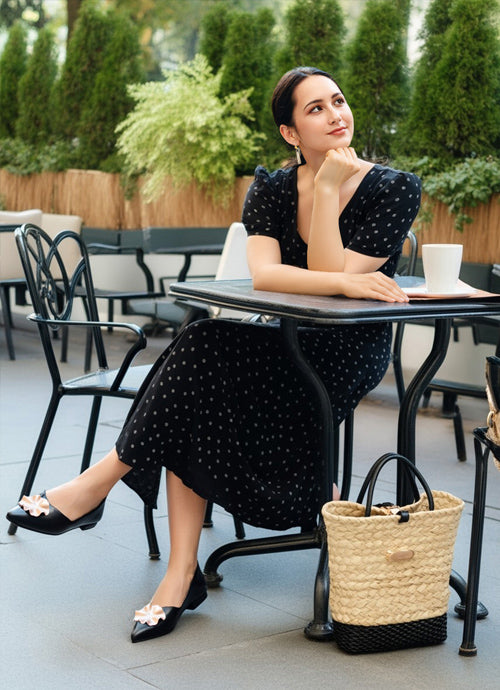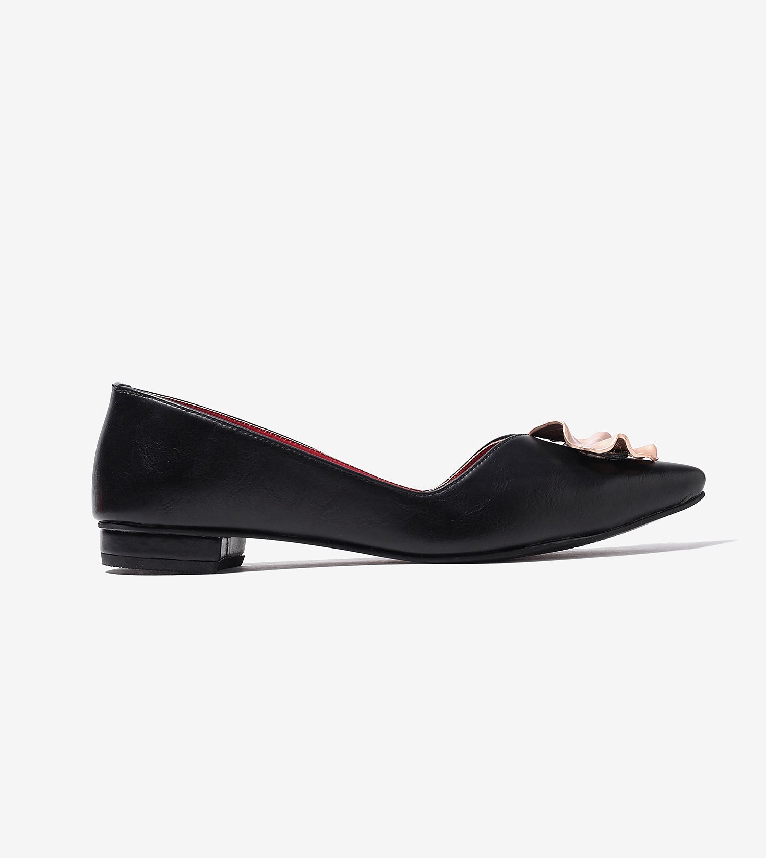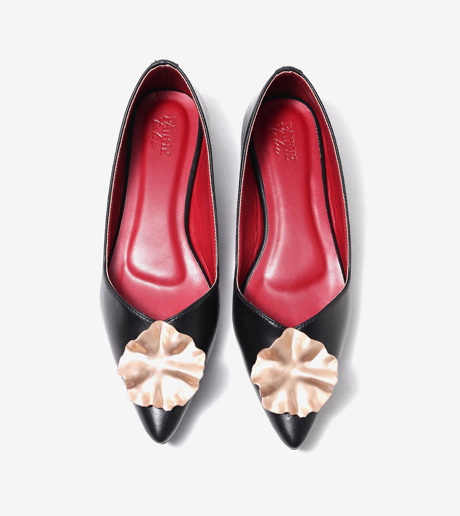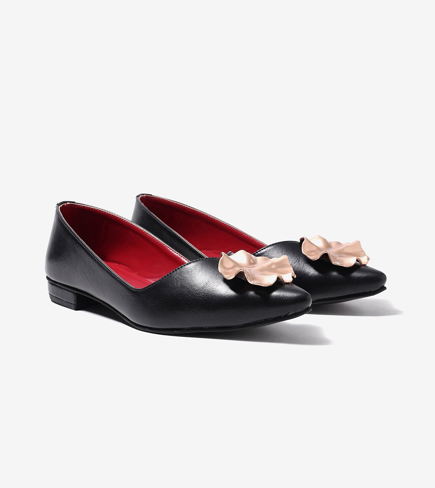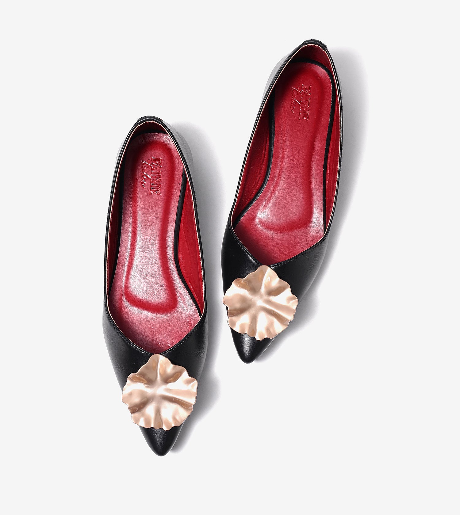 These flats feature a sleek pointed-toe silhouette that elongates your feet and adds a refined, contemporary edge. A metallic abstract trim is placed to accentuate the style of the flats. The low-profile sole ensures day-long comfort, while the contrast red inner lining adds a bold surprise element - like a secret you’ll love knowing. Lightweight, versatile, and easy to pair with everything.