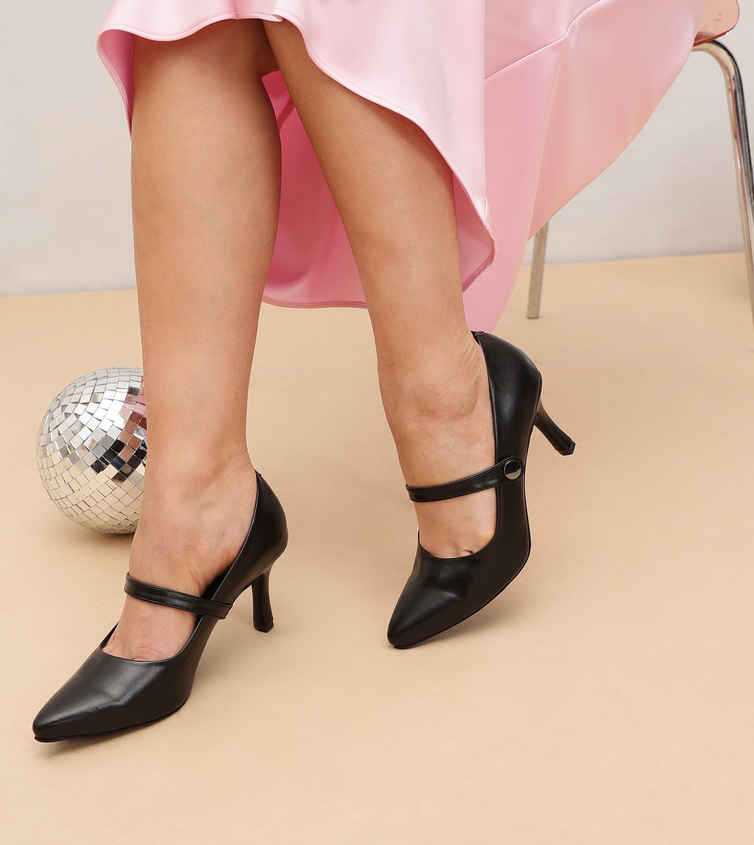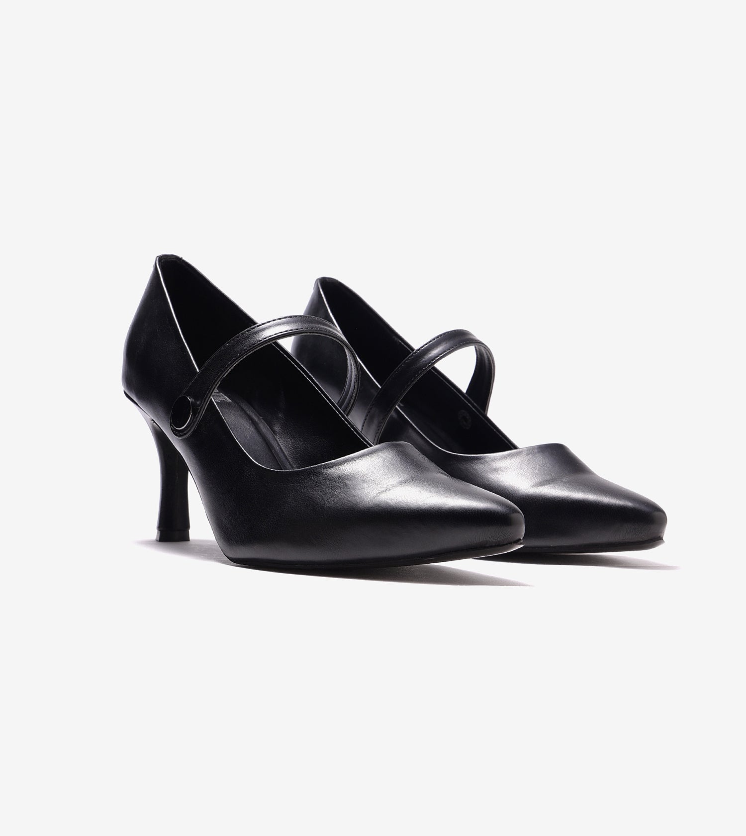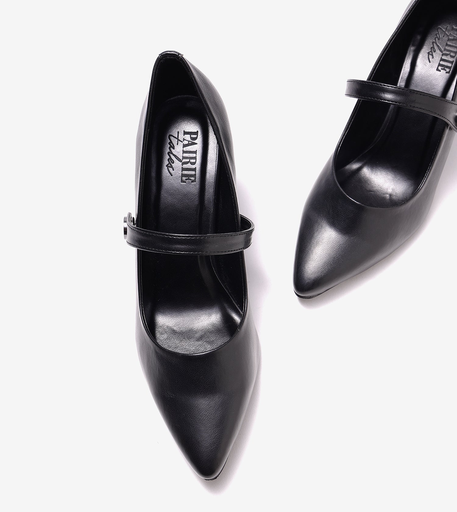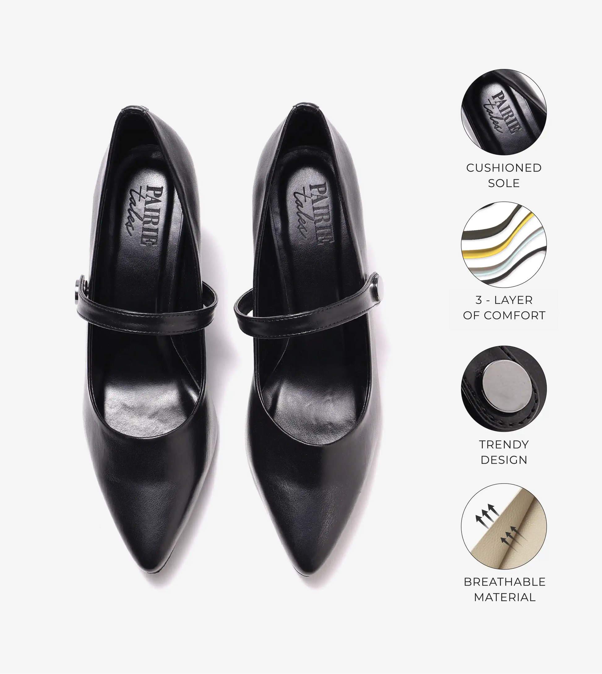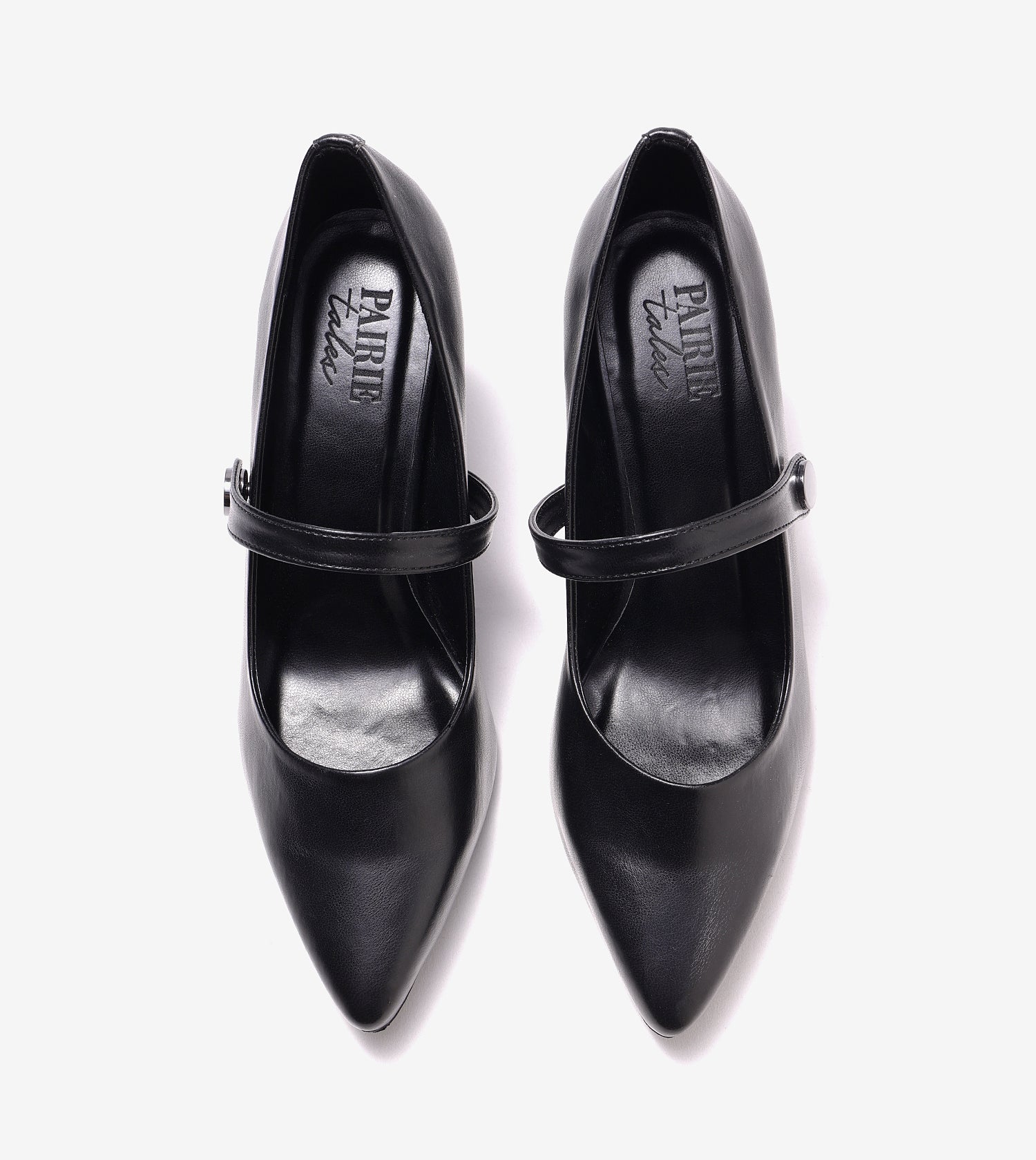 These Mary Jane pumps exude vintage charm, featuring gun metal-toned ring buckle for a touch of elegance. The iconic single-strap design and bold monochrome finish give this classic style a modern twist, while the timeless black hue ensures effortless versatility, making them the perfect complement to any outfit and occasion.