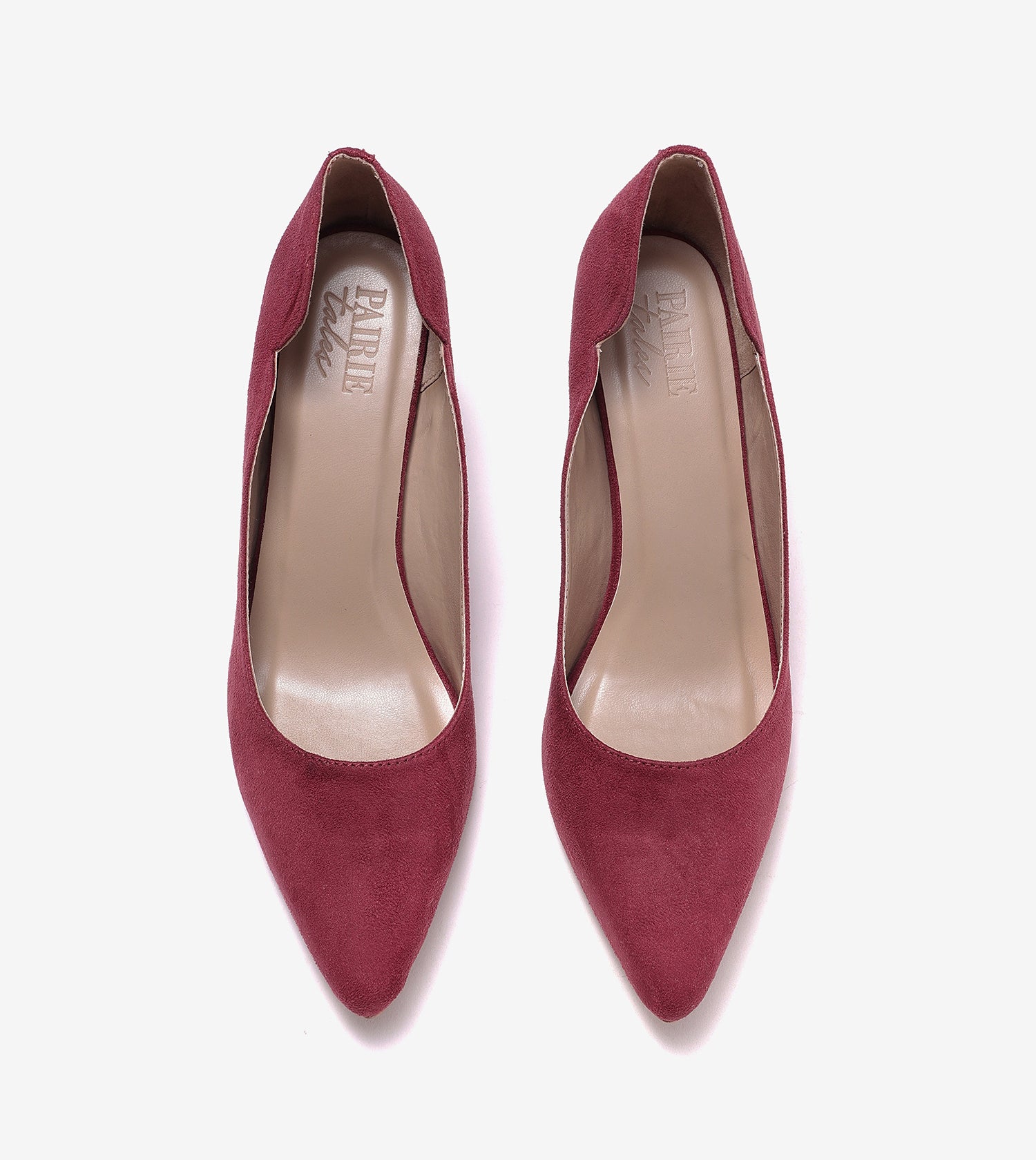 This season, sculpted red pumps are redefined in luxurious suede leather for a fresh, chic update. Perched on a 3-inch wrapped stiletto heel, the sleek upper curves into a bold low-cut vamp, culminating in a sharp pointed toe. The scalloped edges, with visible stitching, add an exquisite, detailed finish for a truly sophisticated look.