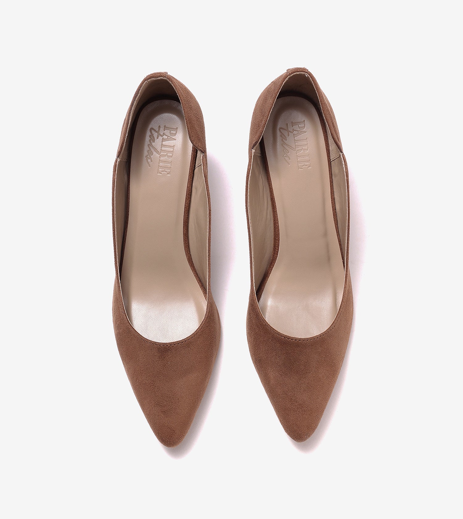 This season, sculpted pumps receive a chic makeover in luxe tan suede leather. Set on a 3-inch wrapped stiletto heel, the sleek upper flows into a daring low-cut vamp, tapering to a pointed toe. The scalloped edge with visible stitching adds a captivating, intricate detail for a truly sophisticated finish.