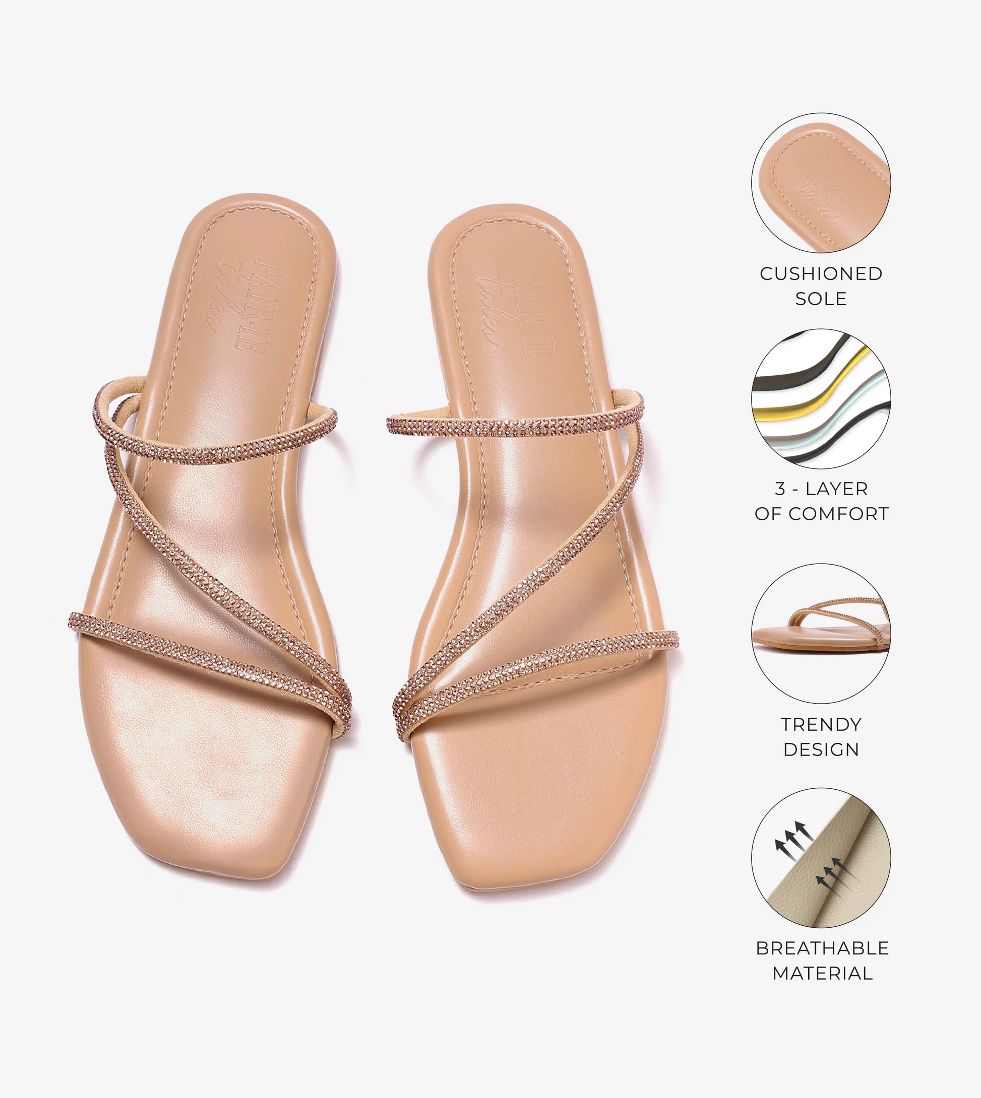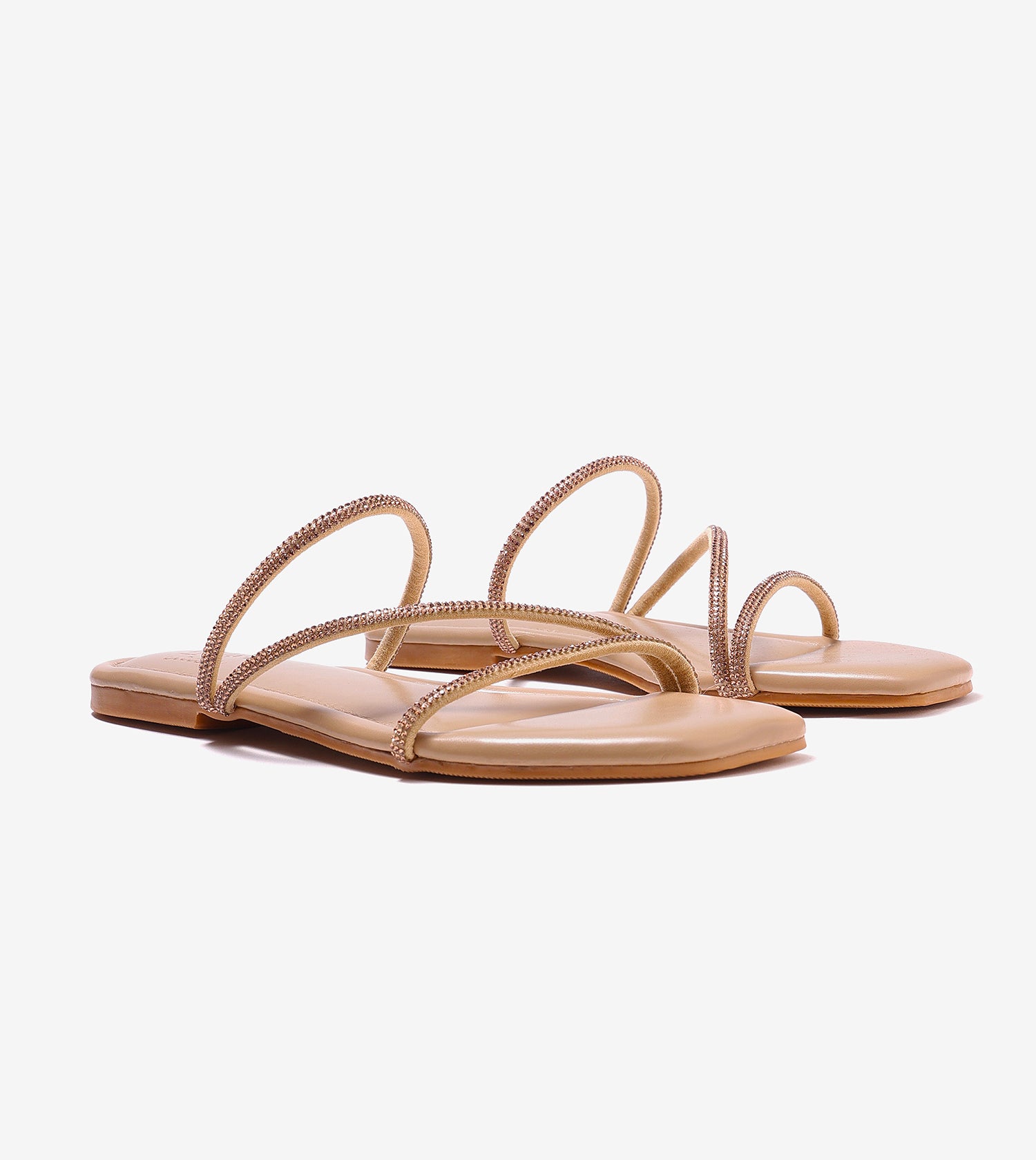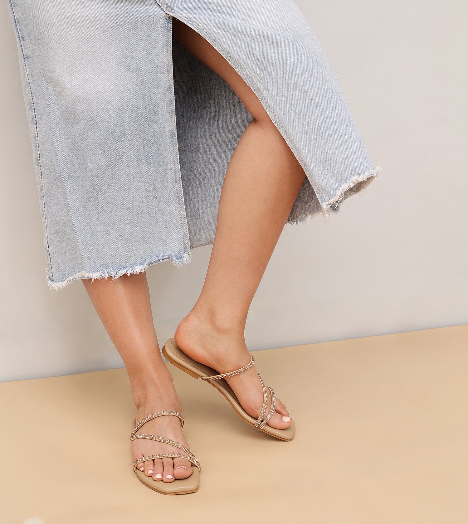 These strappy sandals bring instant glamour to your look with minimal effort. Featuring a dazzling metallic gold finish and delicate crystal embellishments on the straps, they offer just the right amount of sparkle. Designed with open toes for breathability and flat soles for all-day comfort, this chic pair will effortlessly elevate your everyday outfits.