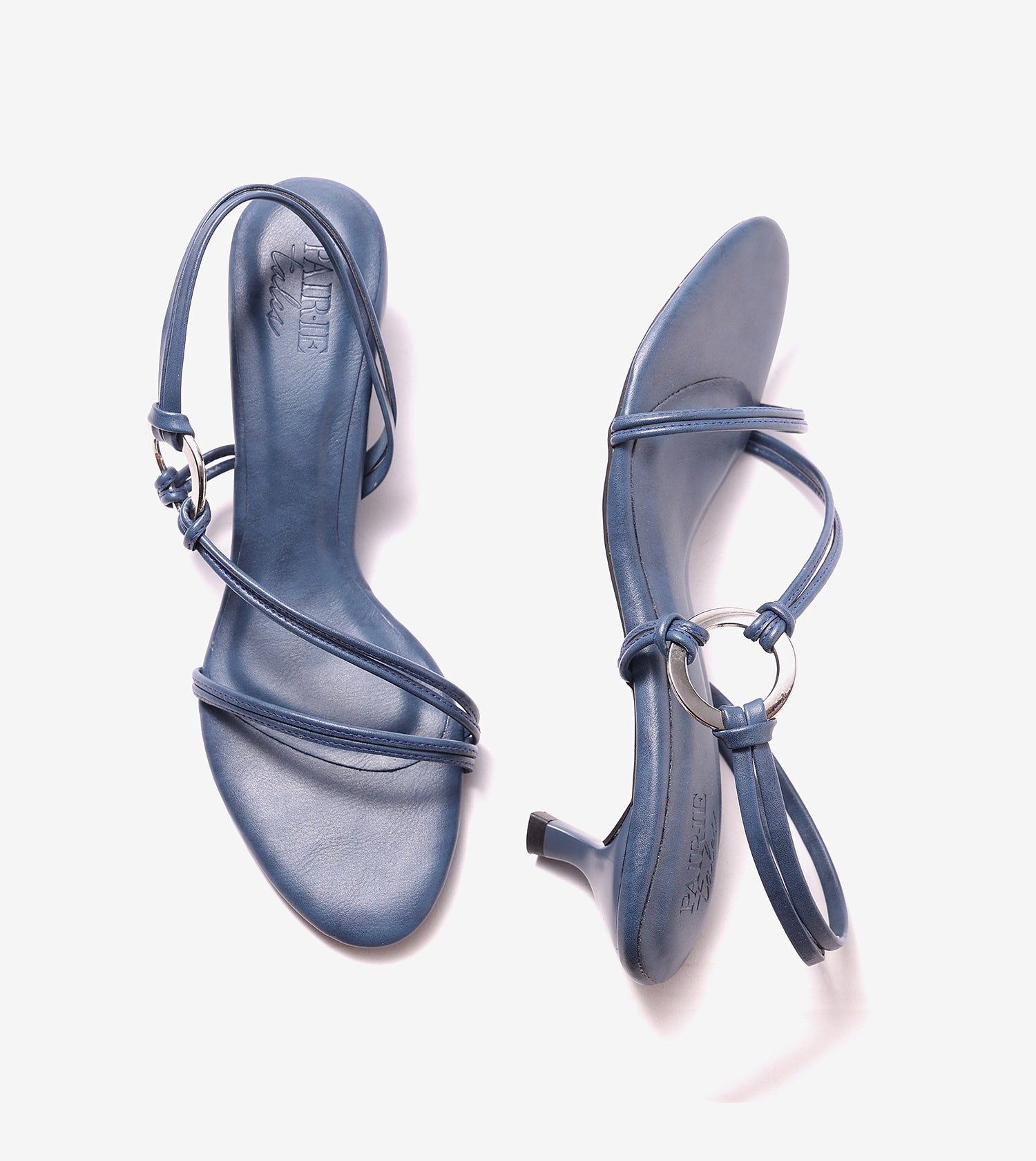Make a striking statement with our monochrome pair - these minimalist kitten-heeled sandals do it with ease. Featuring a sleek strappy design enhanced by metallic ring details on the side, this blue pair will keep you stylish and confident throughout the day.