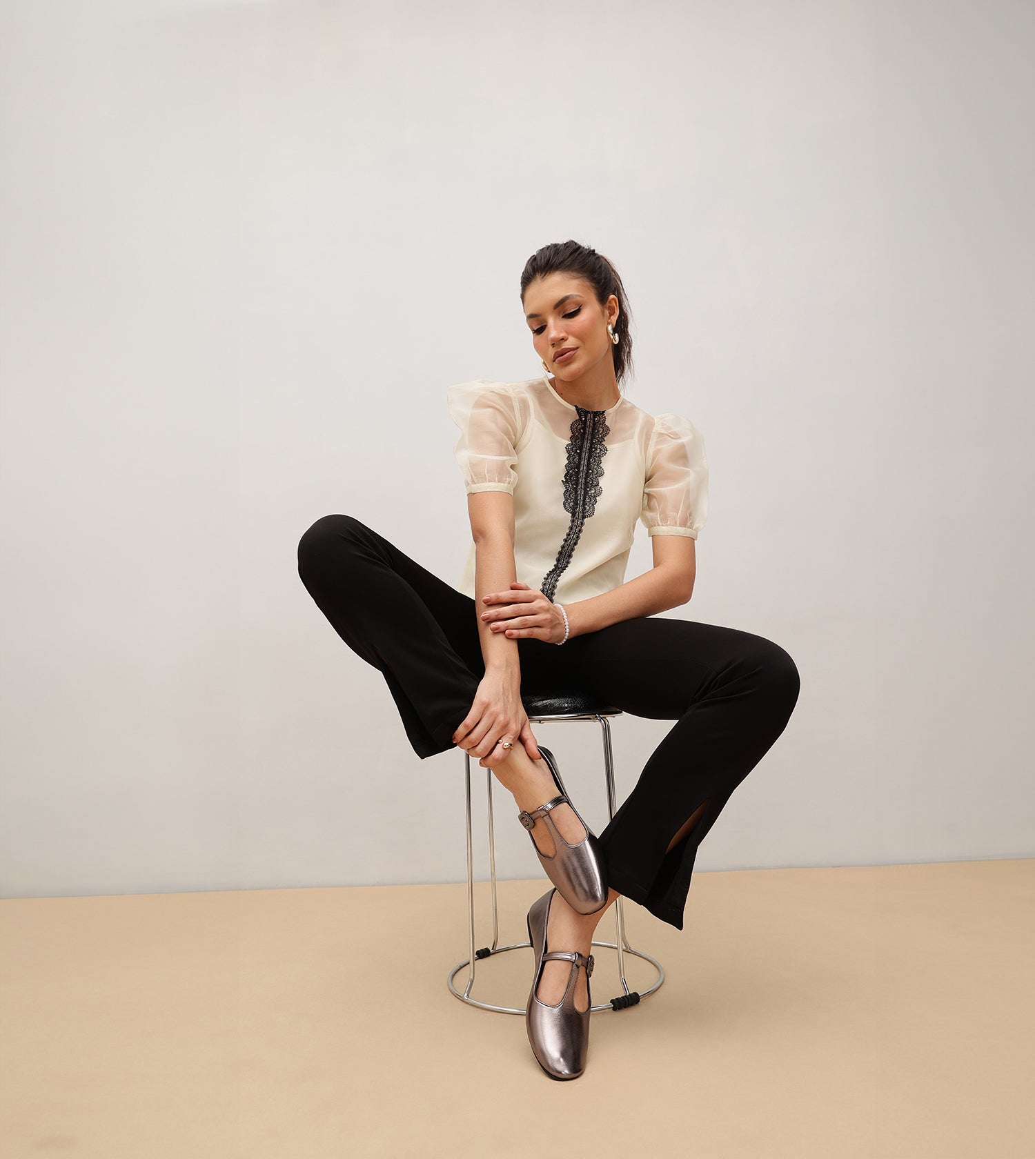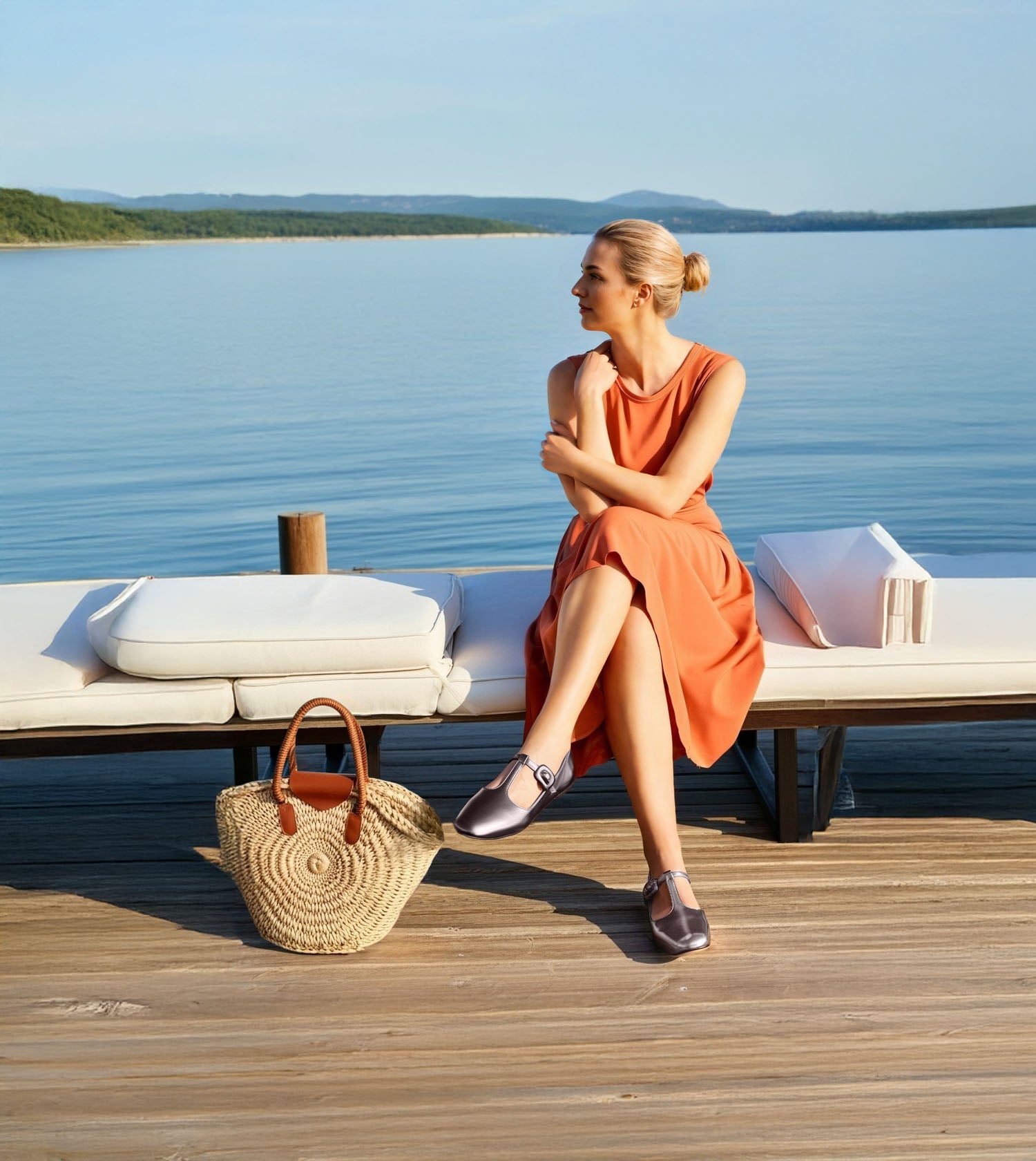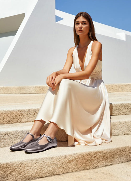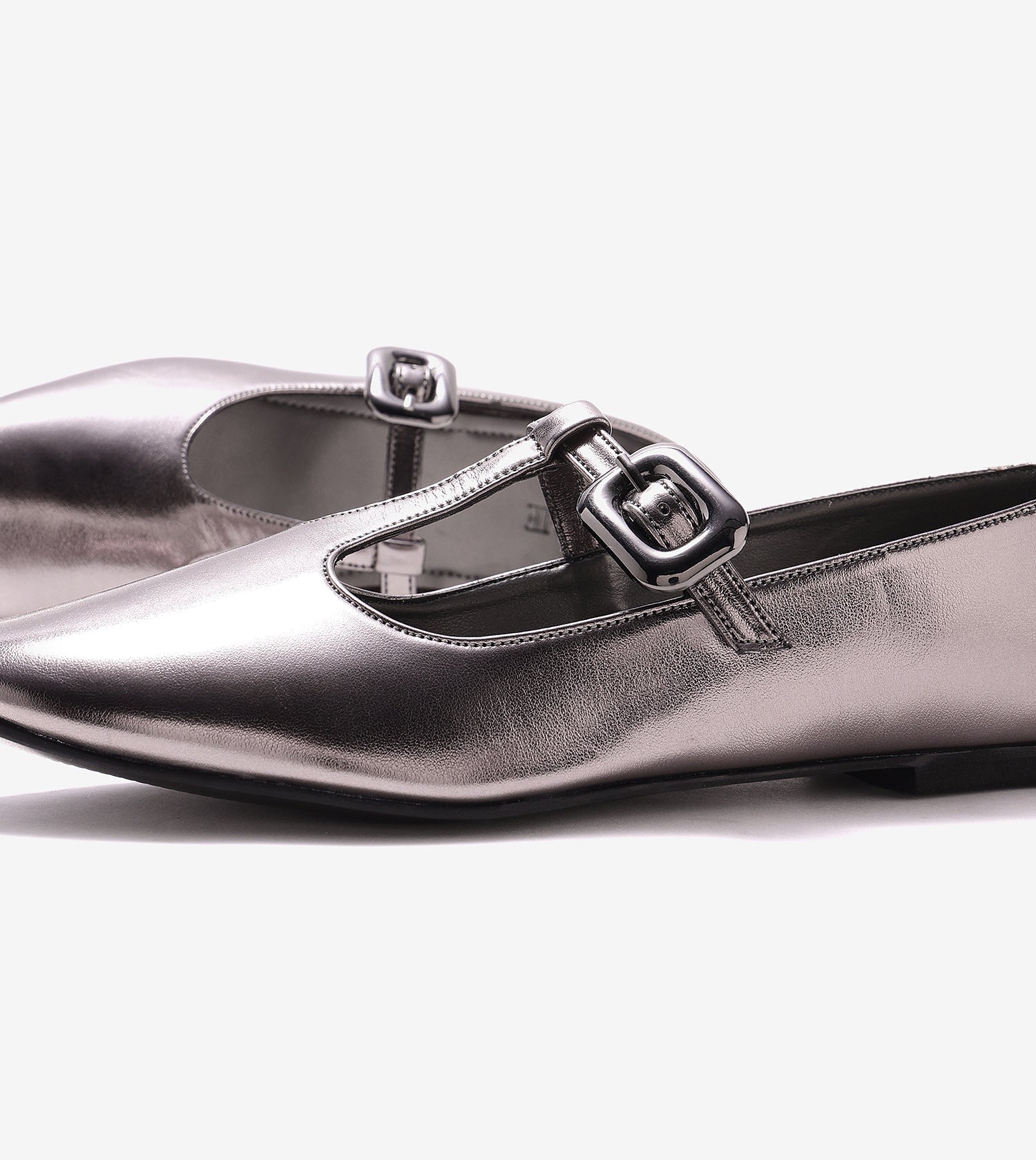 These pointed-toe flats are crafted in a lustrous metallic finish that instantly elevates any outfit, making them the perfect statement pair for day-to-night dressing. The silhouette features a streamlined round toe that elongates your feet, offering a polished look. A standout T-strap with a big metallic buckle closure ensures a secure fit. The structured upper is sleek yet soft, while the cushioned footbed and low-profile sole provide comfort for all-day wear.