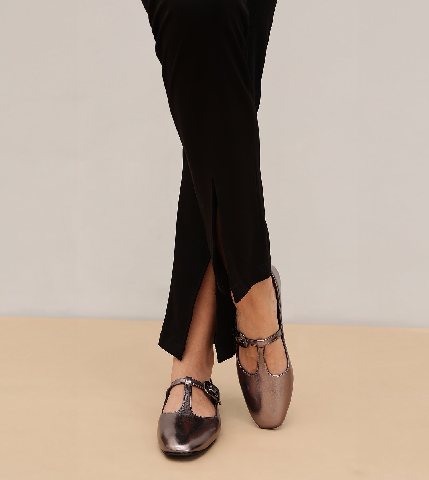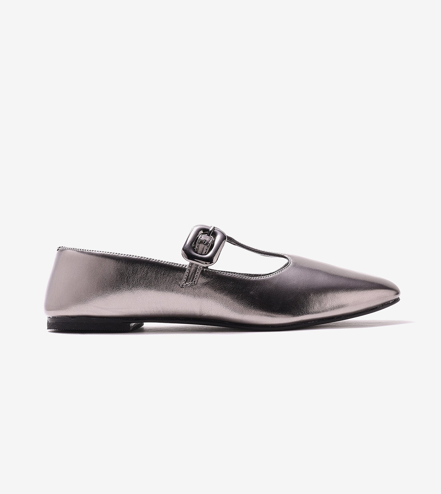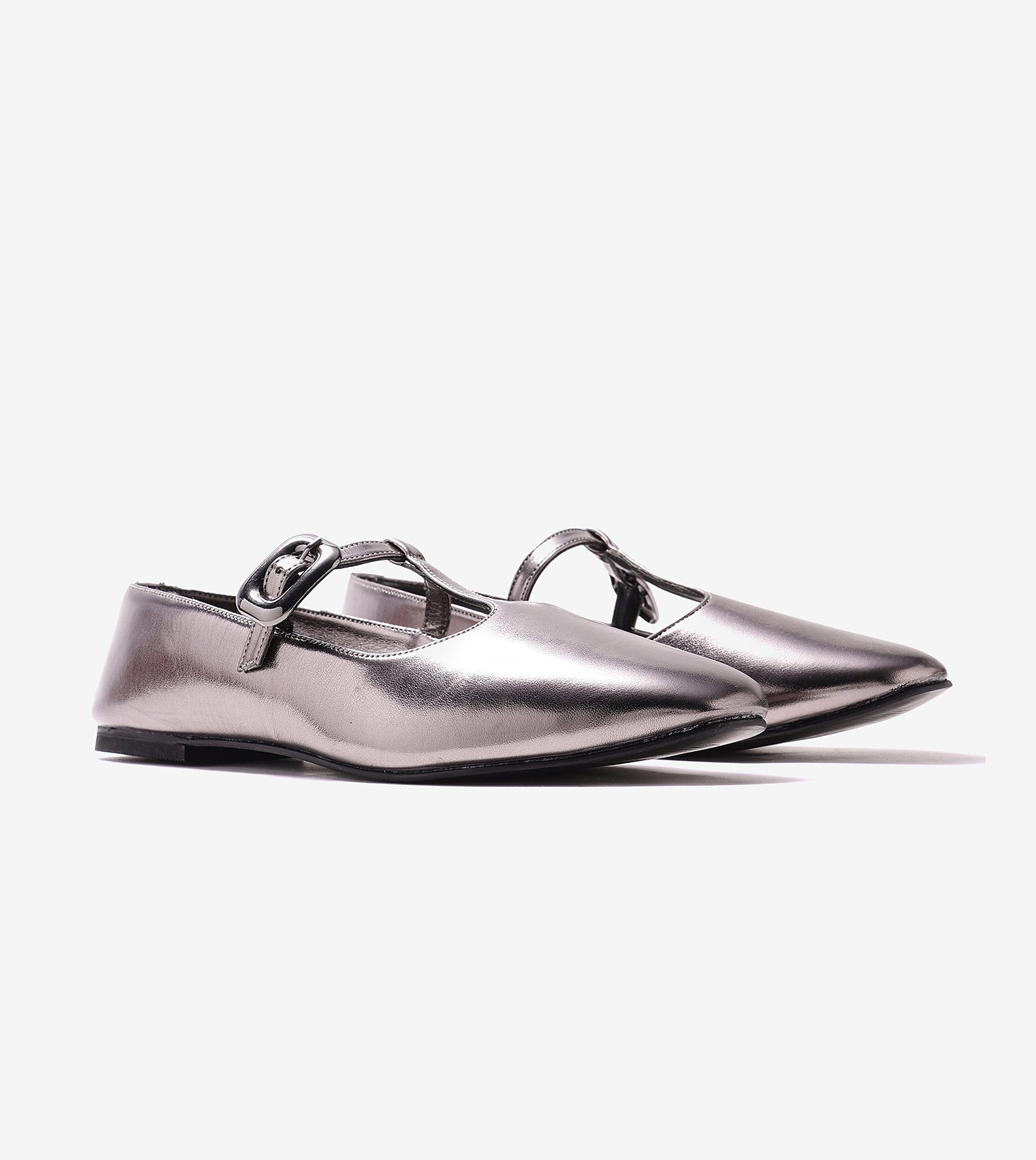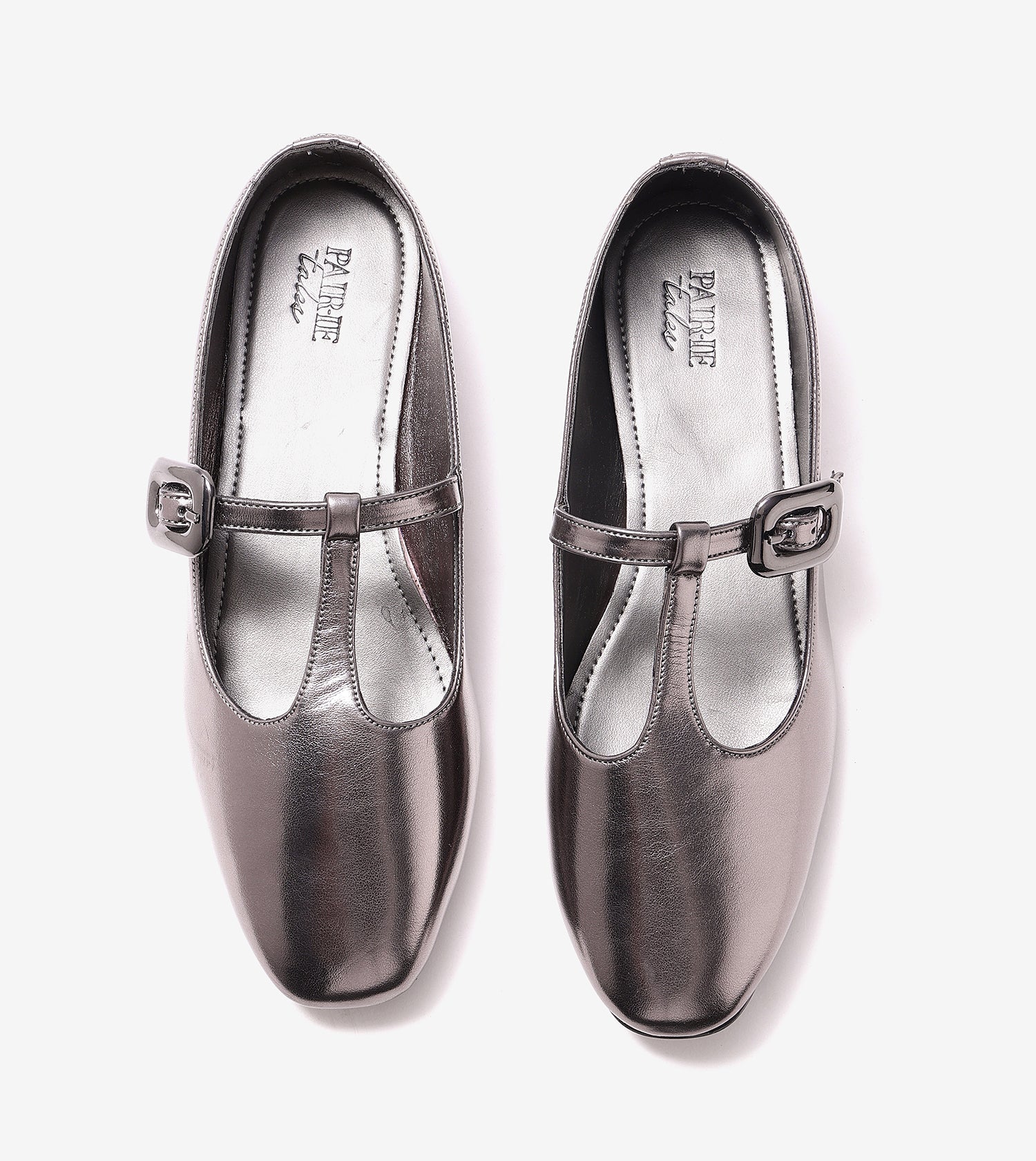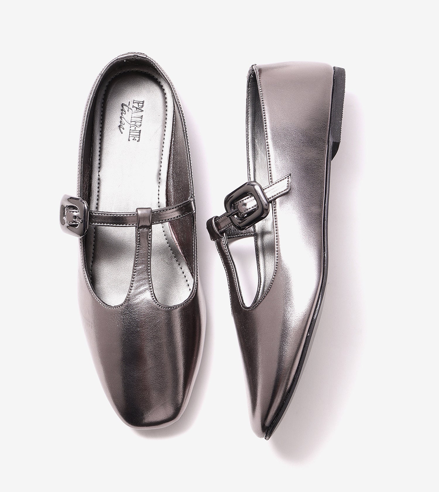 T-Strap Metallic Mary Janes Flats - Gunmetal