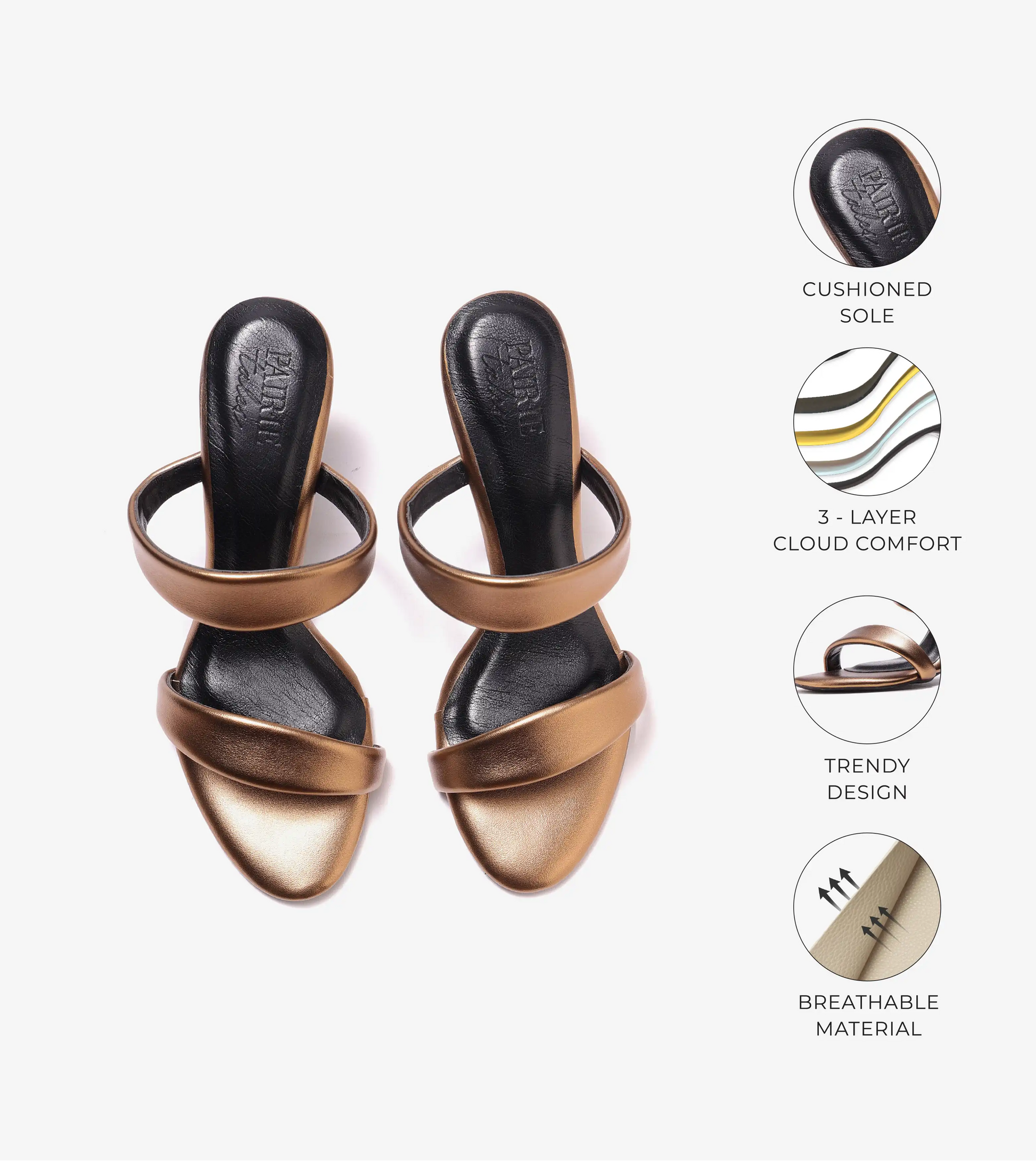 For a chic and effortless option that transitions from dress-down Fridays to weekend outings, these heeled mules are the perfect choice. The metallic copper finish offers versatility, effortlessly complementing any outfit and suiting a variety of occasions. Featuring a sleek double-strapped design and wide trapeze stiletto heels, these mules are crafted for all-day comfort.