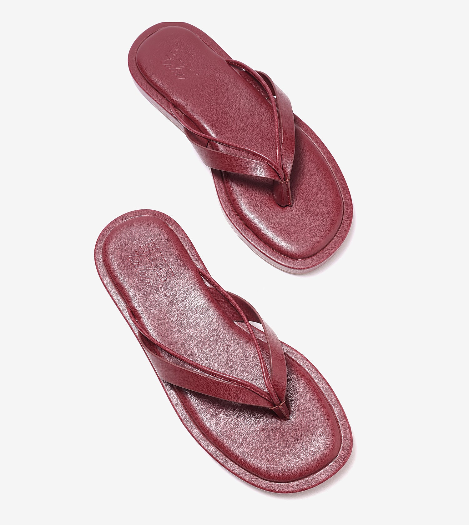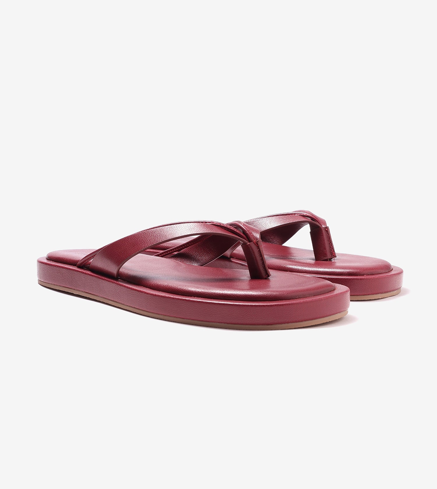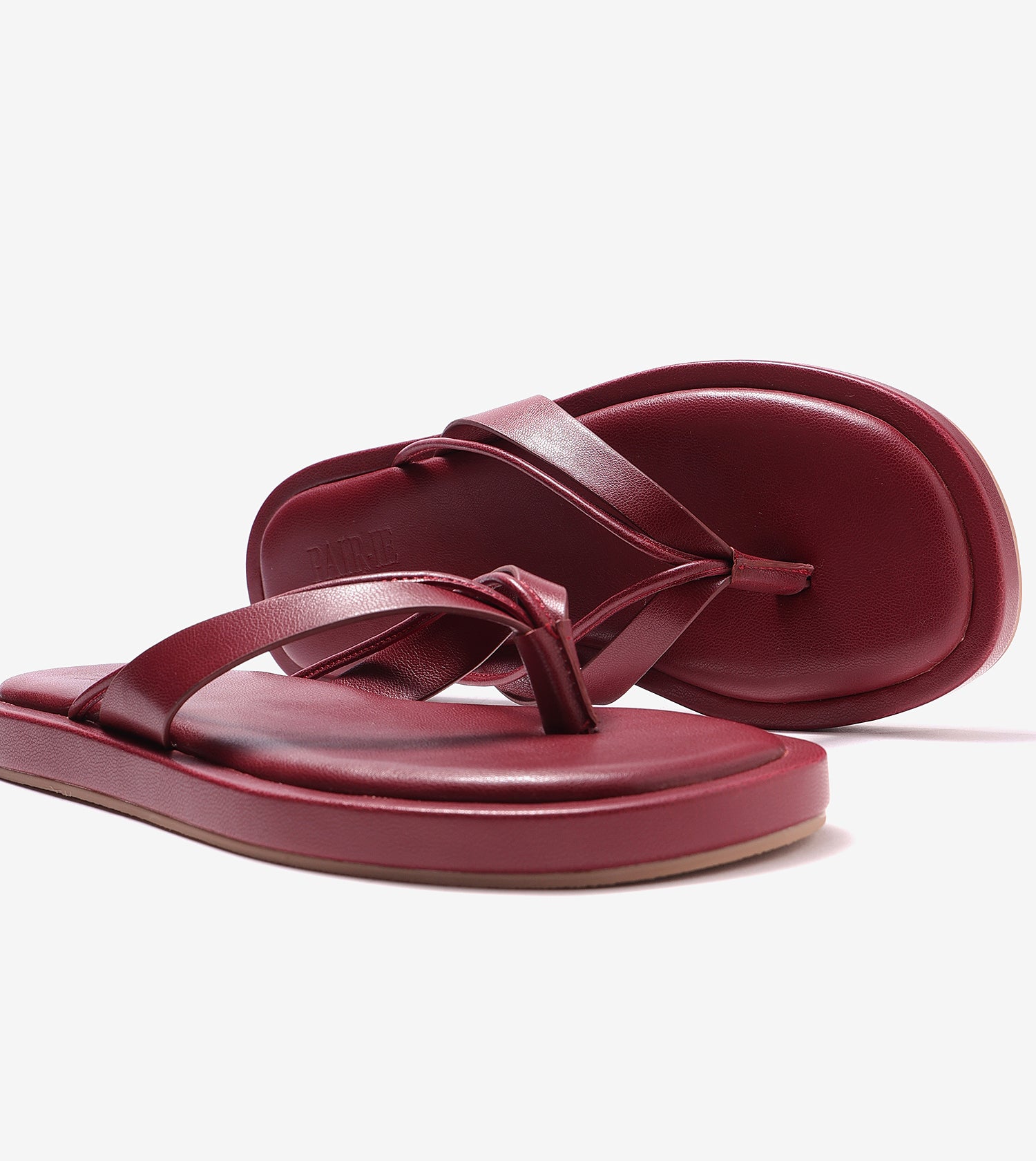 Embodying ultimate minimalism, this classic flip-flop is reimagined in soft faux leather with slim, rounded straps for a refined touch in rich maroon. The addition of a cushioned footbed ensures comfort, making it the perfect blend of simplicity and style.