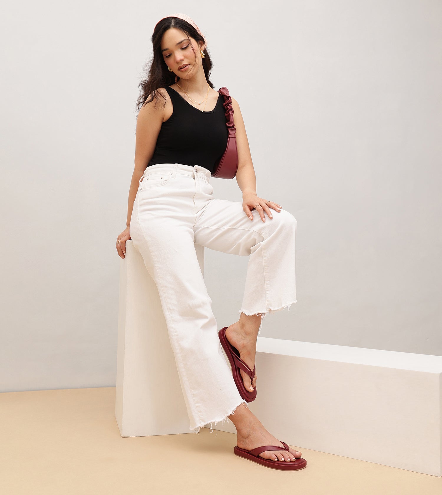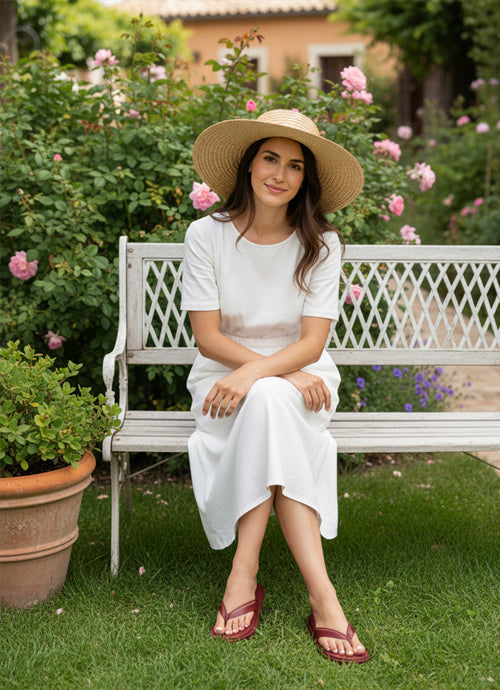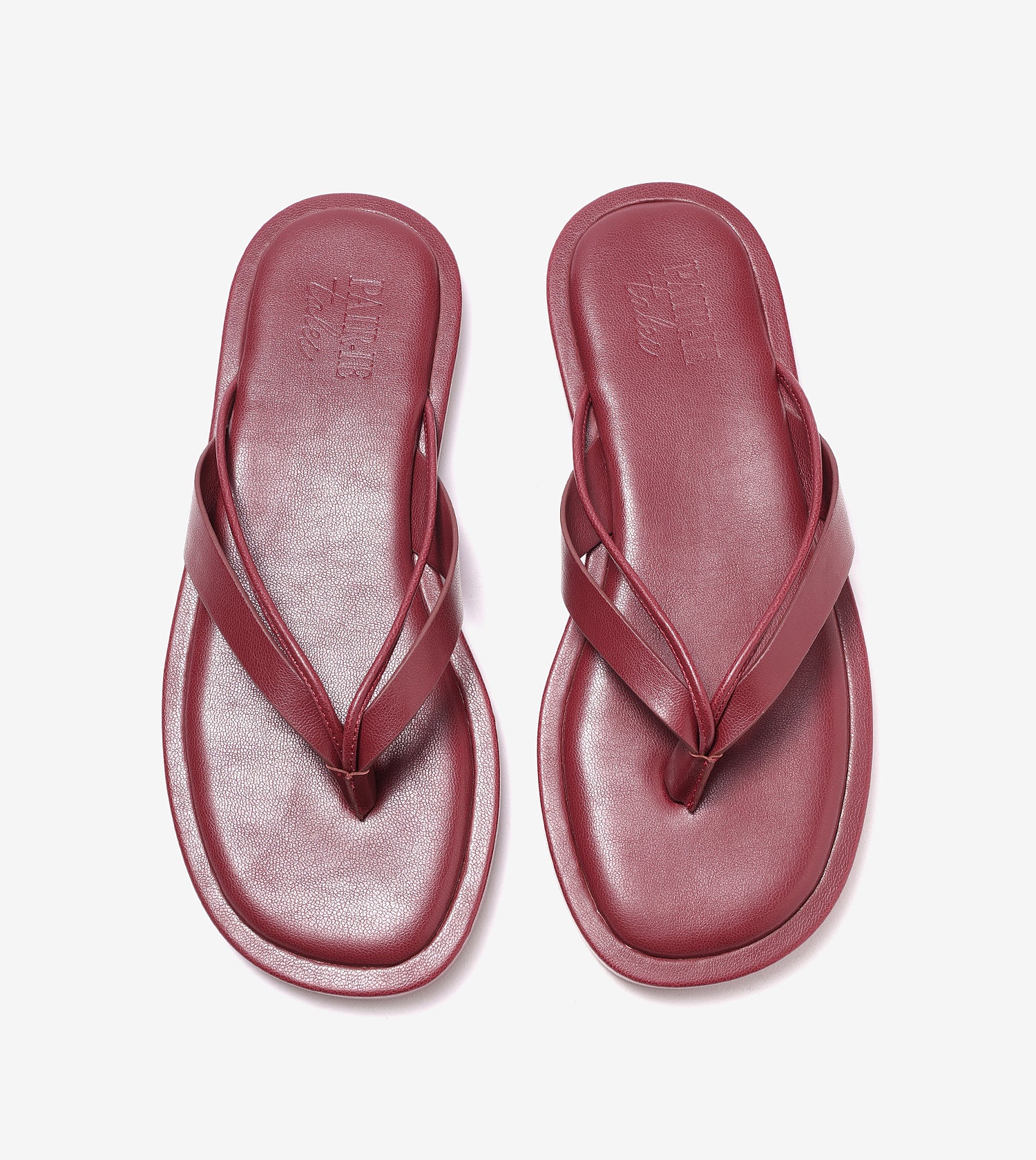 Embodying ultimate minimalism, this classic flip-flop is reimagined in soft faux leather with slim, rounded straps for a refined touch in rich maroon. The addition of a cushioned footbed ensures comfort, making it the perfect blend of simplicity and style.