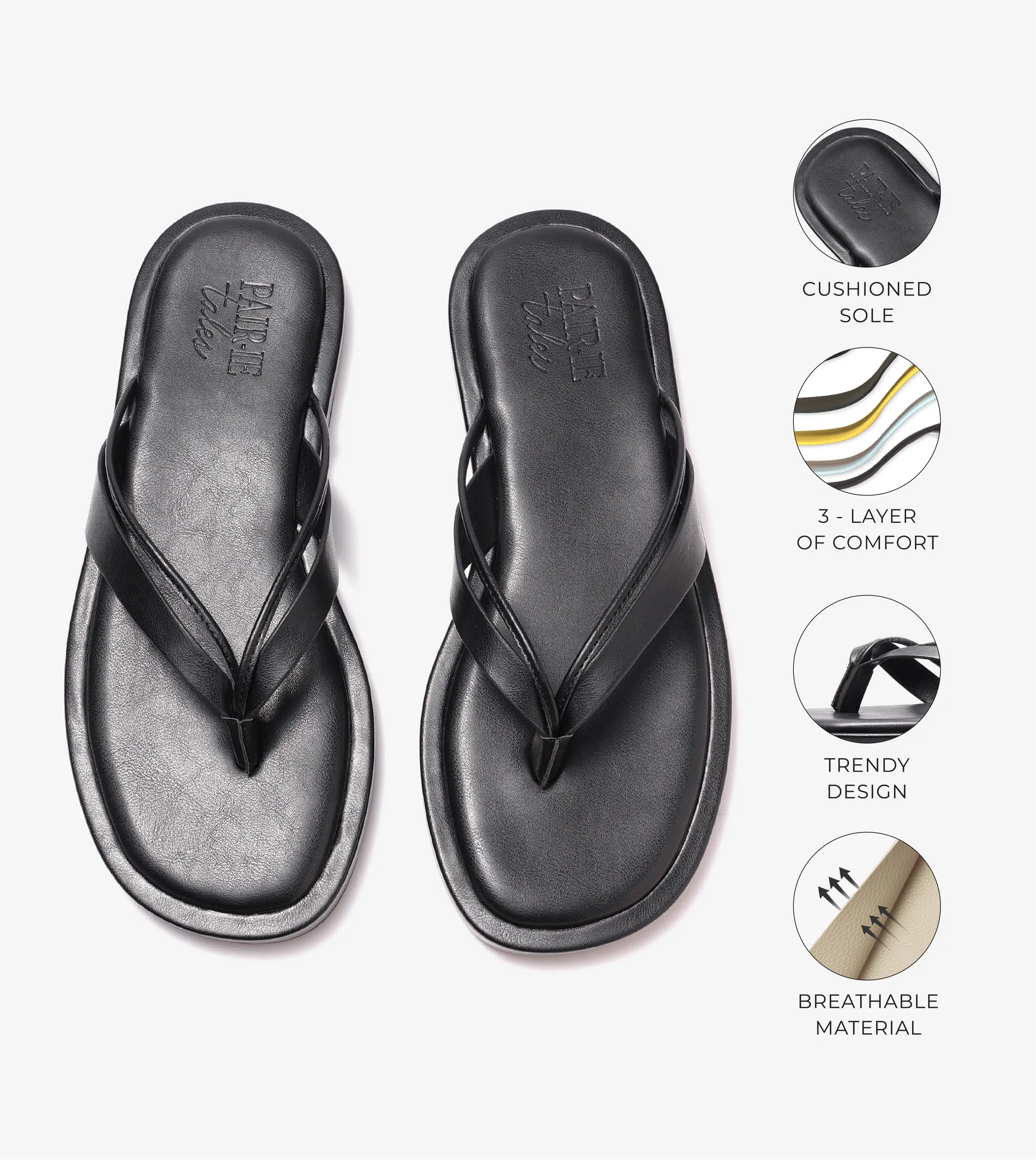 Embracing ultimate minimalism, this classic flip-flop is crafted in soft faux leather with slim, rounded straps in sleek all-black. The cushioned footbed adds a layer of comfort, offering the perfect fusion of simplicity and style.