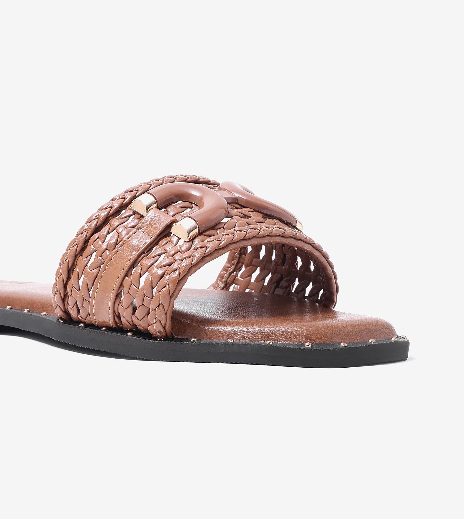 Designed to combine artisanal texture with everyday comfort, these slide flats feature an intricately woven strap accented with a bold buckle detail for a statement finish. The broad upper offers a secure and supportive fit, while the cushioned footbed ensures ease through long hours of wear. Finished with subtle stud detailing along the sole and a slip-on silhouette, this pair blends contemporary style with effortless functionality.